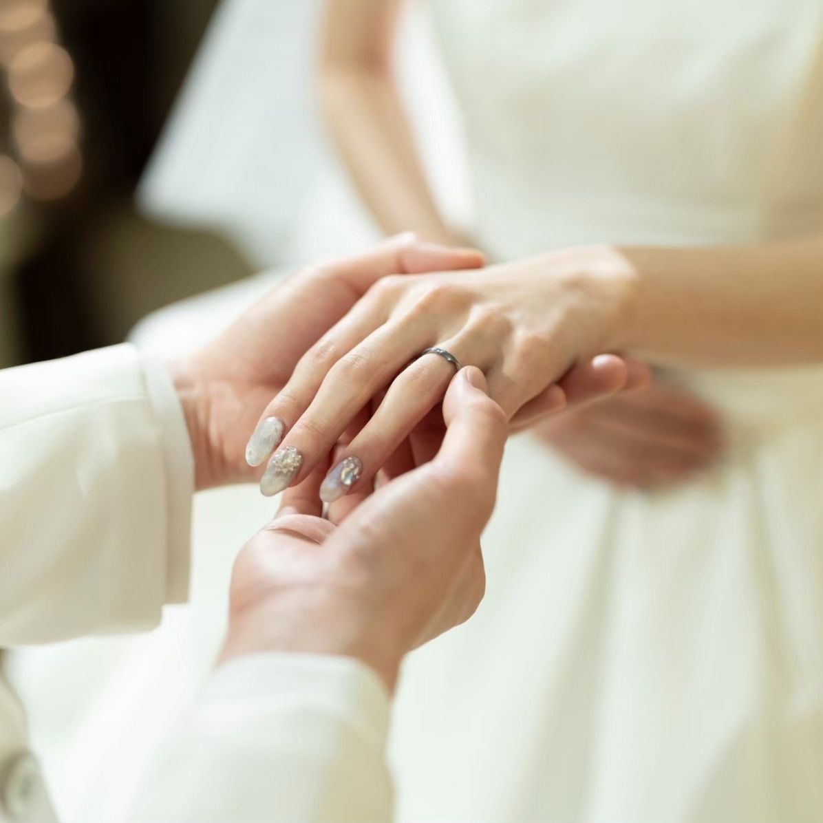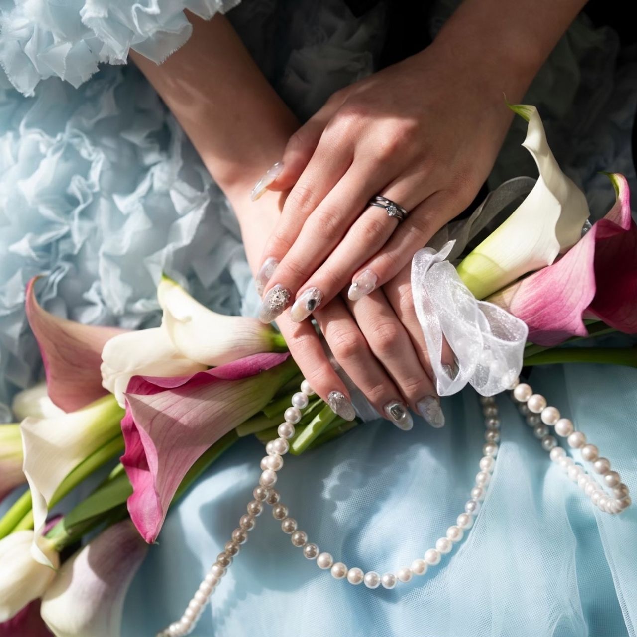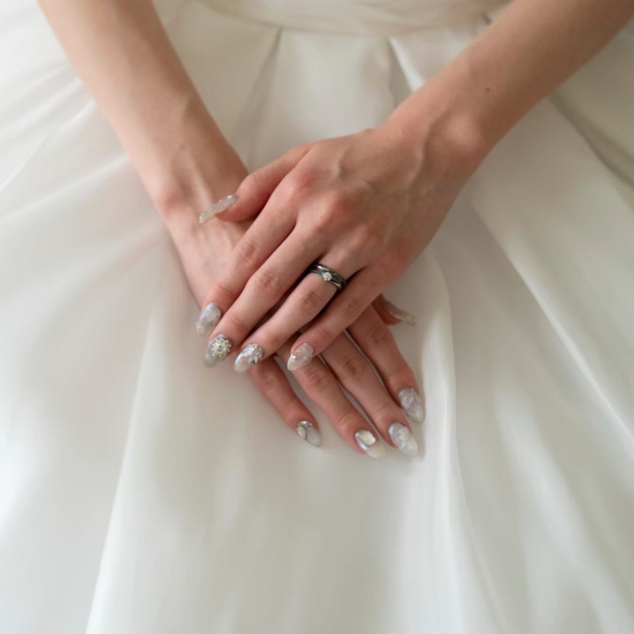 ネイルは、お色直しでドレスの色当てクイズを予定していたため、色を悟られないよう白を基調にしました!ネイリストの友人に施術してもらえたことも特別な思い出になり、仕上がりも含めて大満足でした!