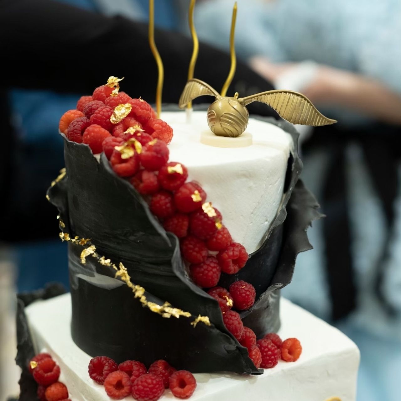 ハリー・ポッターのダークトーンな世界観を表現したく、ケーキには黒を取り入れてデザインしました。金箔やスニッチ、キャンドルでゴールドを散りばめ、さらにベリーの赤をアクセントにしています。かっこよさと可愛さを両立させたデザインで、とてもお気に入りのケーキになりました!