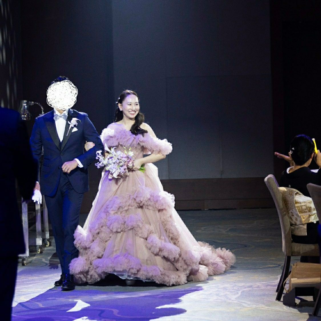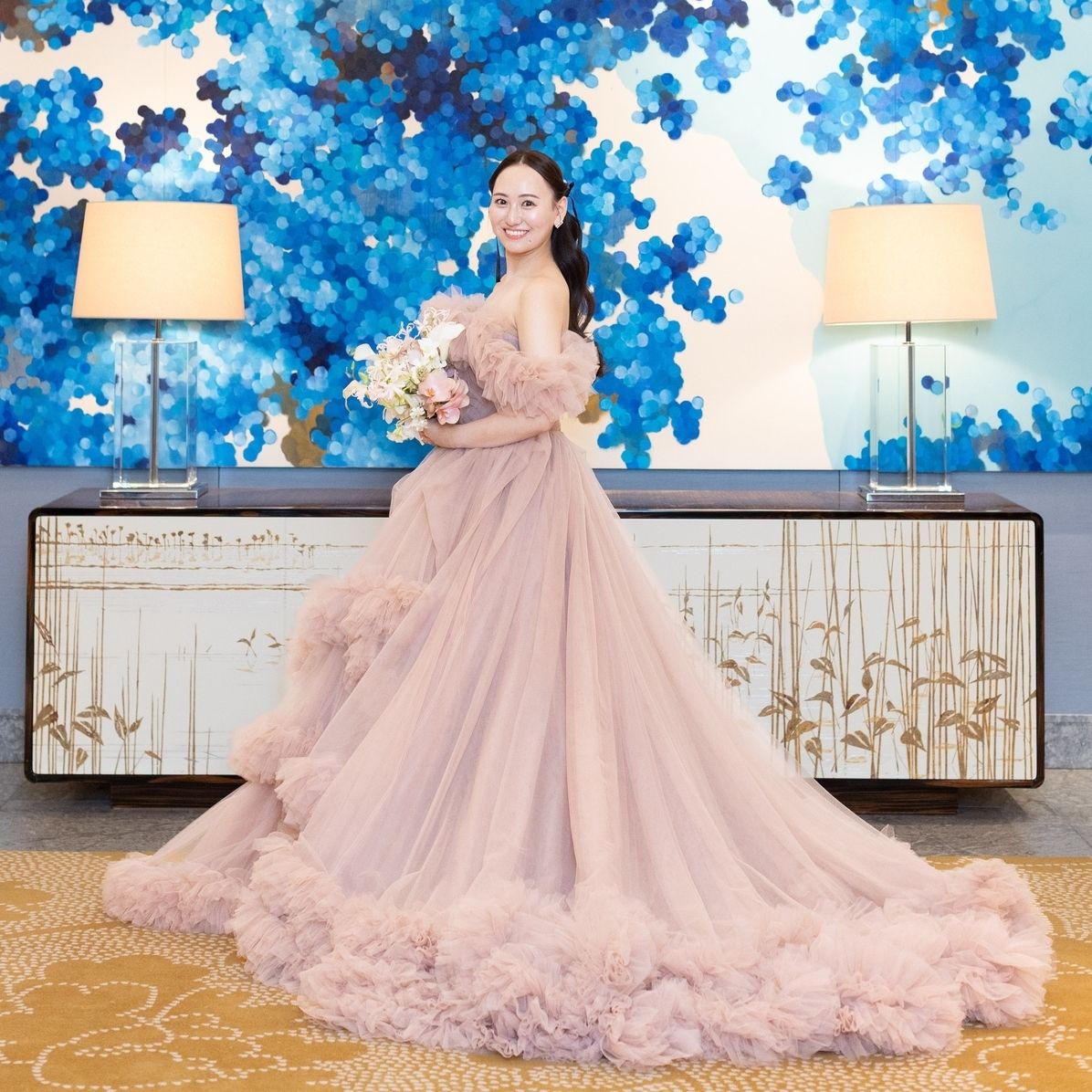 ウェディングドレスがキラキラだったので、カラードレスはガラッと雰囲気を変えたく、ふわふわの柔らかいマットピンクのドレスにしました!