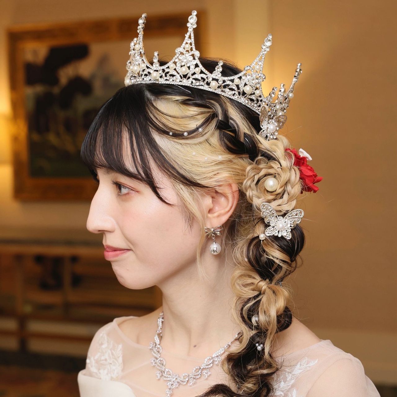 付属のティアラとヘッドドレスを着用