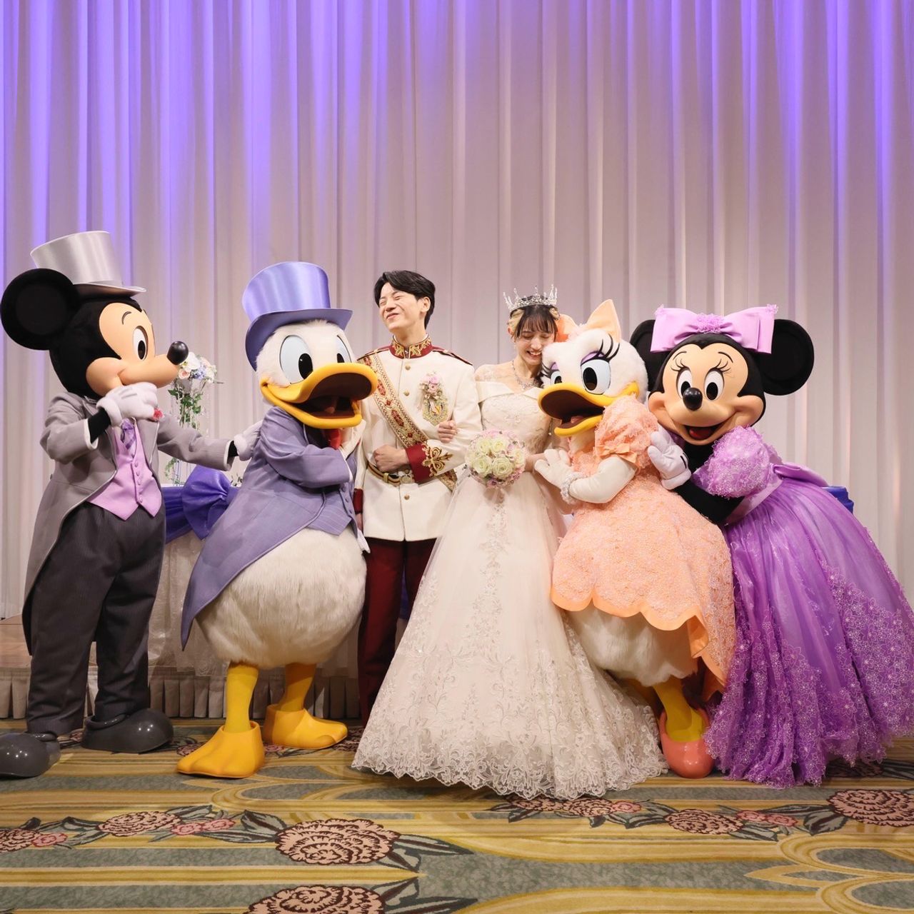 披露宴ではケーキカットのシーンにミッキー・ミニー・ドナルド・デイジーが駆けつけてくれ、大好きなキャラクターに囲まれながら迎える、笑顔と幸せにあふれたひとときとなりました。