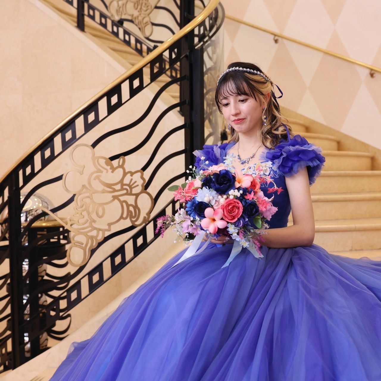 実写版シンデレラをモチーフにしたドレスで、何層にも重なったチュールが本当に美しく、光の加減でさまざまな色に見えるところが、作品の世界観を忠実に再現しているポイントです。