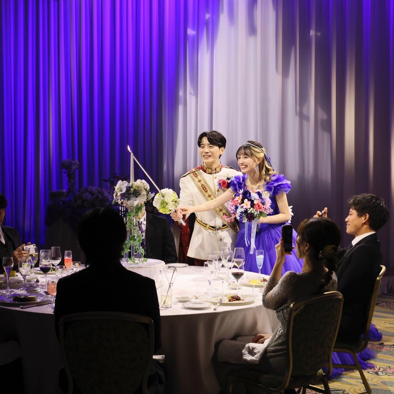 キャンドルサービスではシンデレラの世界観をイメージした演出付きのメインキャンドルが用意されており、柔らかな光とともにロマンチックで幻想的な空間が広がり、披露宴の中でも特に印象に残るシーンとなりました。
