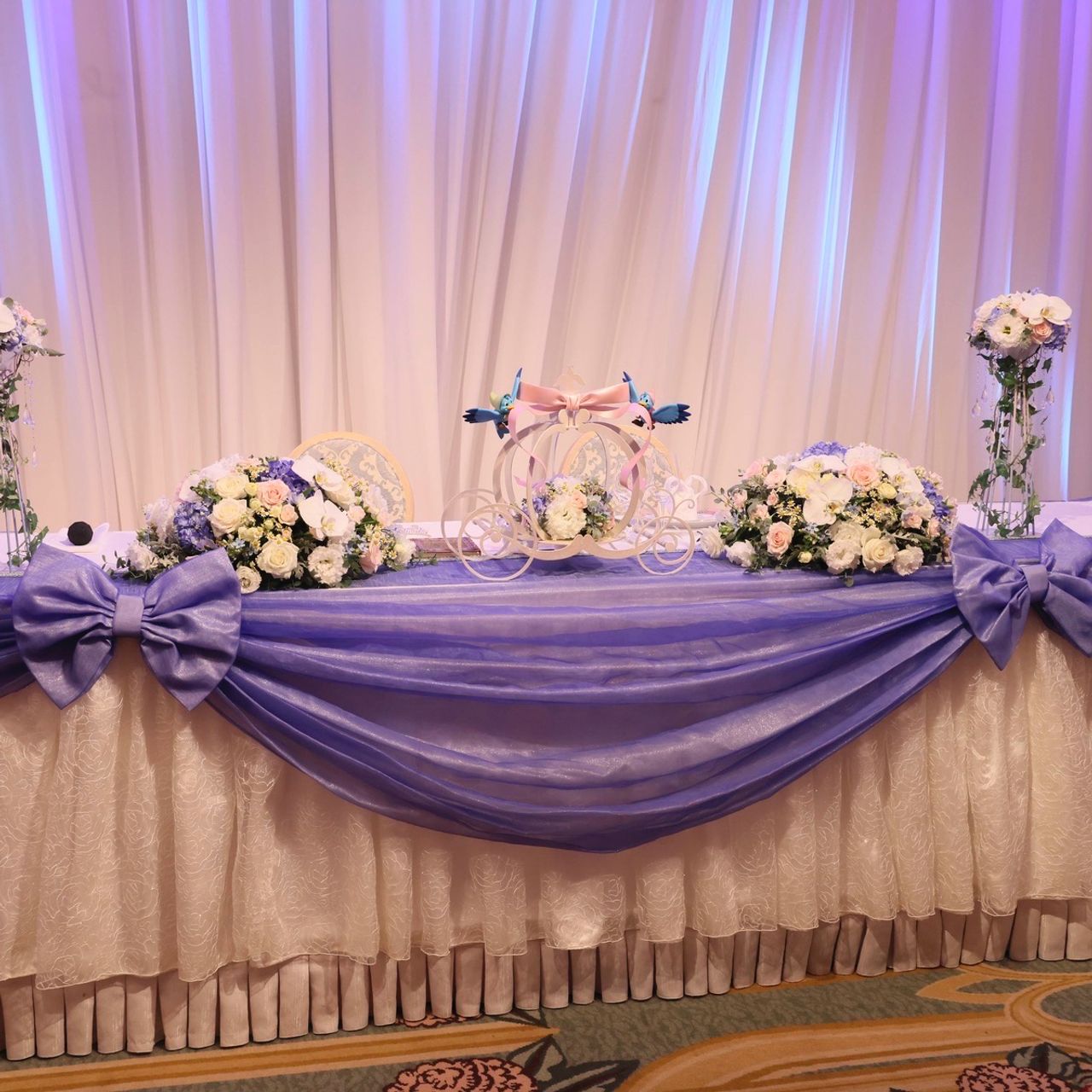 シンデレラの世界観に合う素敵な装花で、淡いピンクと水色もしくは濃いピンクと青の2パターンから選ぶことができます。