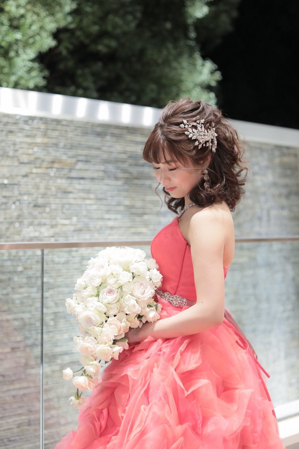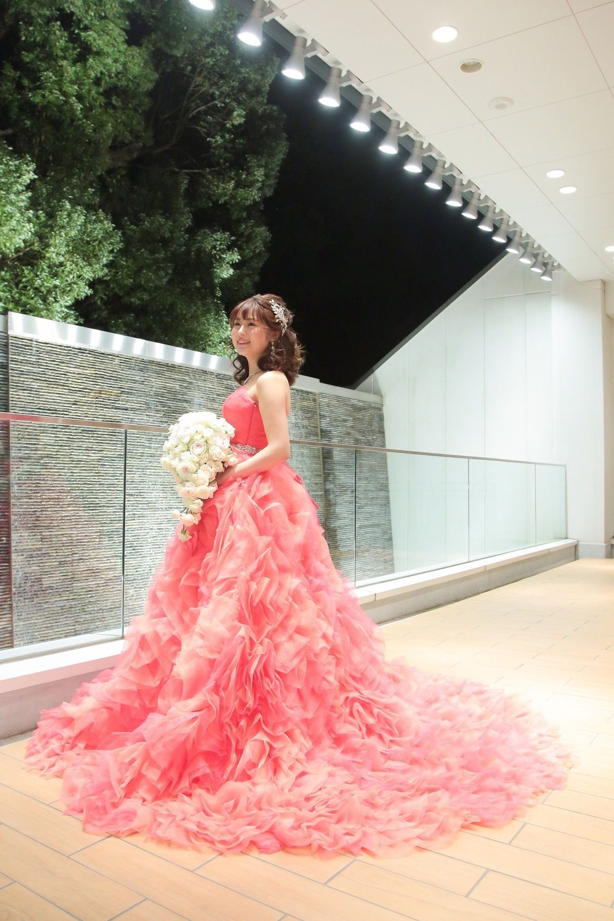 「赤っぽいピンク、ピンクっぽい赤」という大好きなコーラルピンクのカラードレスを選びました。裾の広がりとボリュームと後ろ姿が特に気に入っています。
