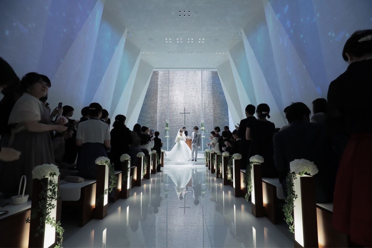 チャペルは地下にあり、天井は地上まで吹き抜けになっています。真っ白なチャペルの正面には大きな窓があり、そこから差し込む光と外の滝とが相まって大変美しく幻想的で、ゲストの皆さんからの評判も大変良かったです!