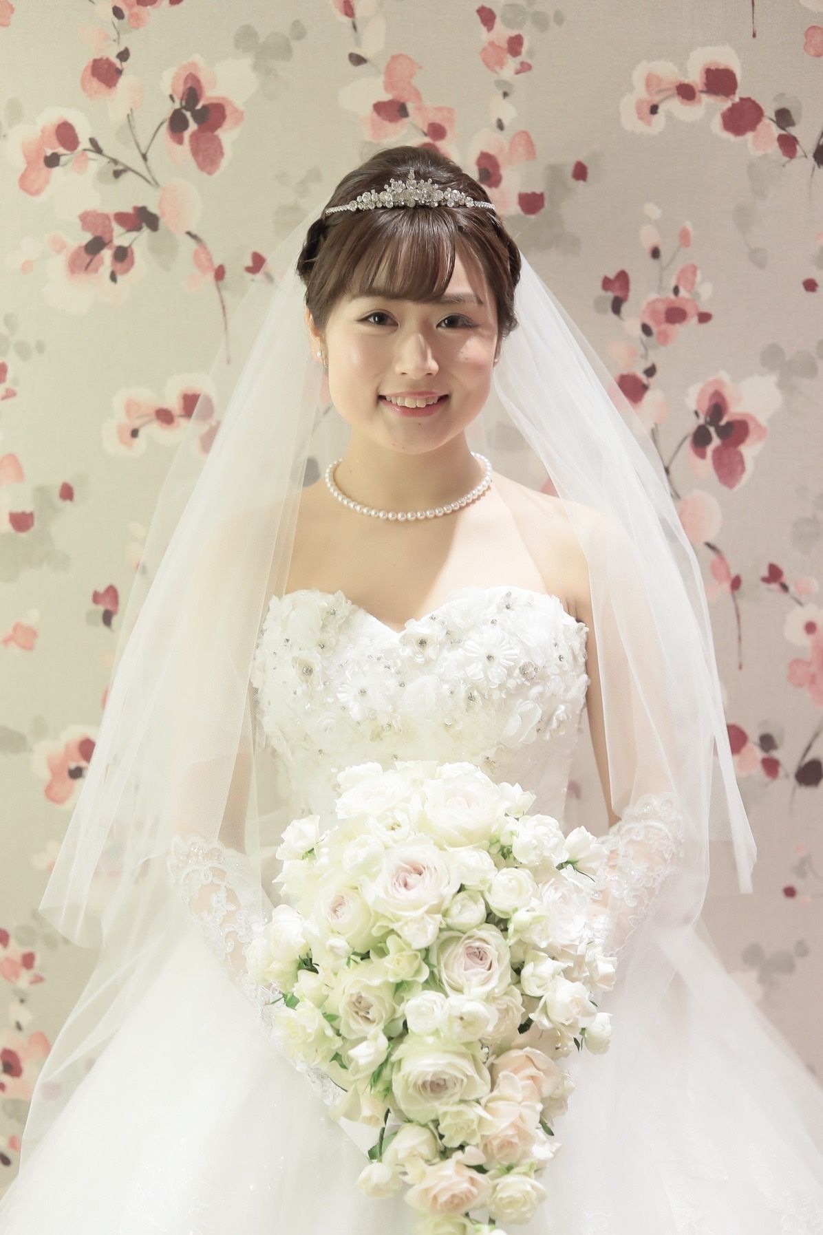 披露宴ではベールを外して左右に後毛を出し、少しナチュラルな感じにしました。