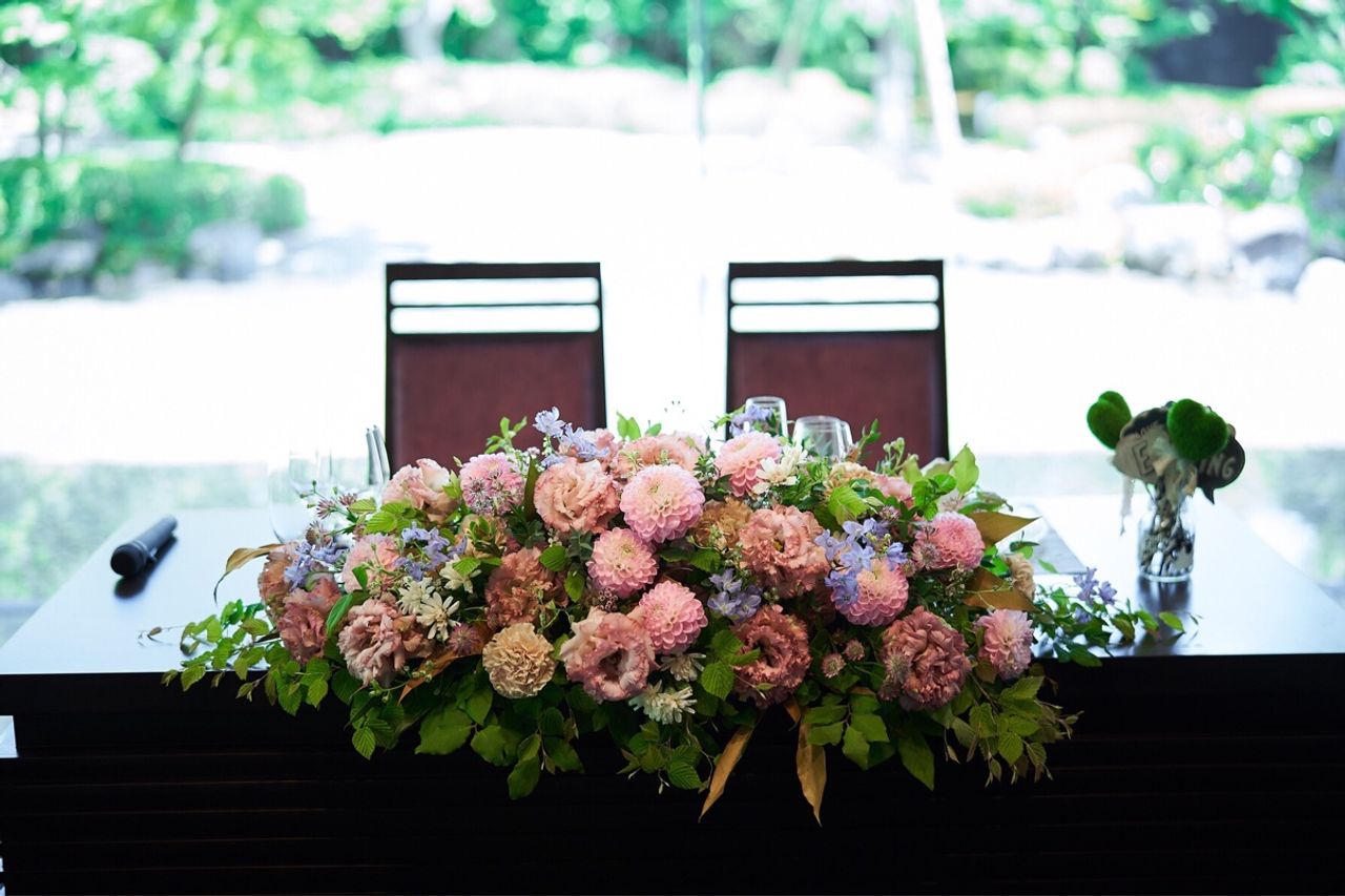 メイン装花はブーケのピンクに合わせてアンティークなピンク〜白に近いピンクをMIXしてお任せで。