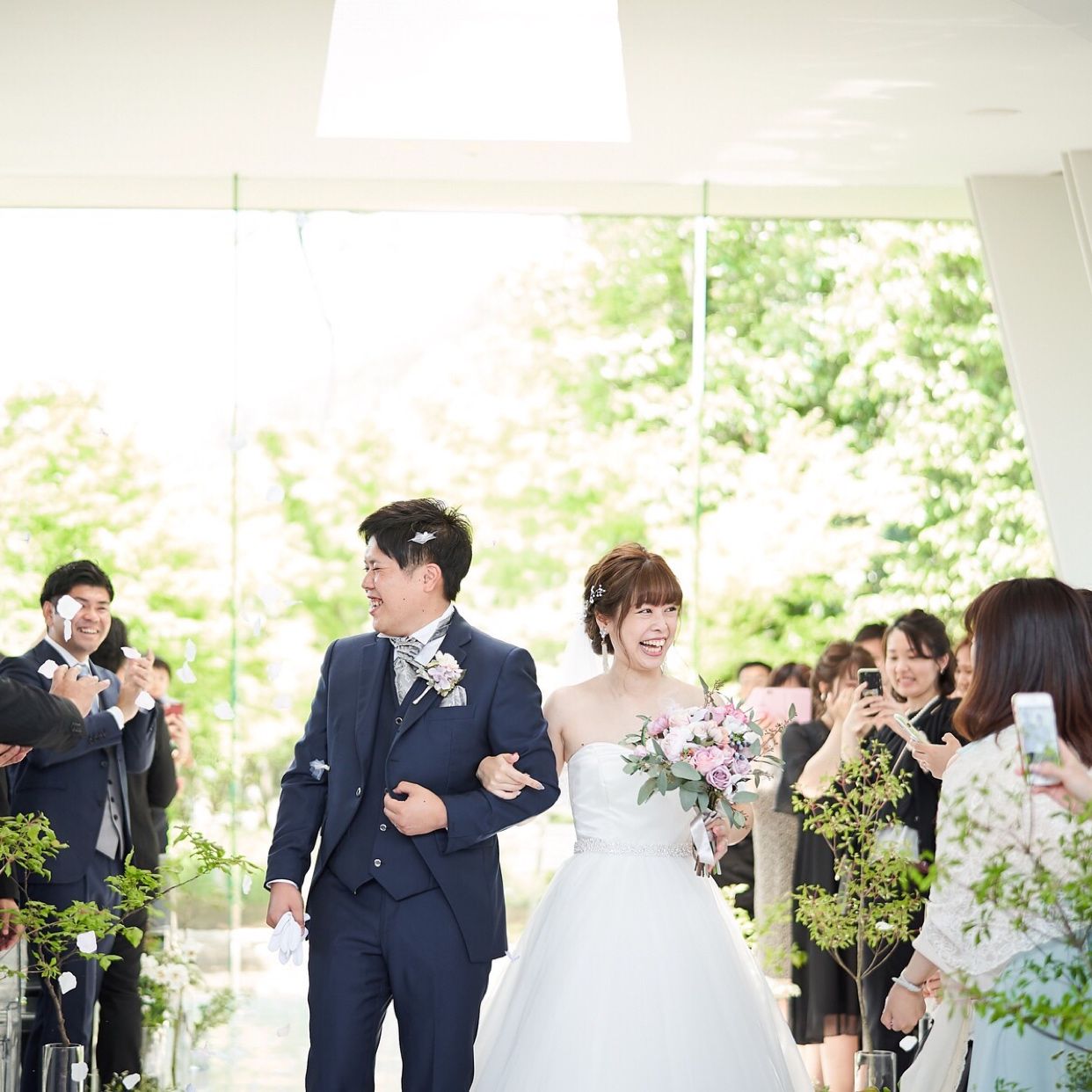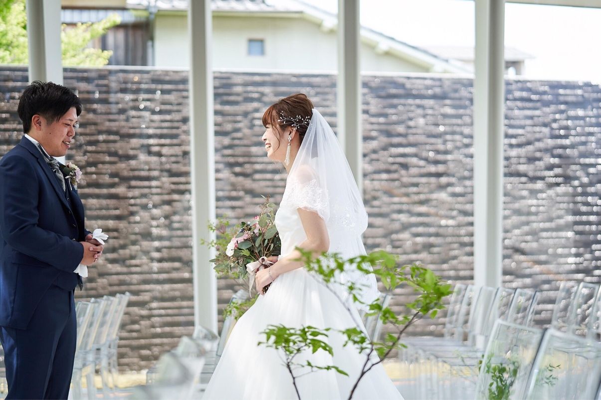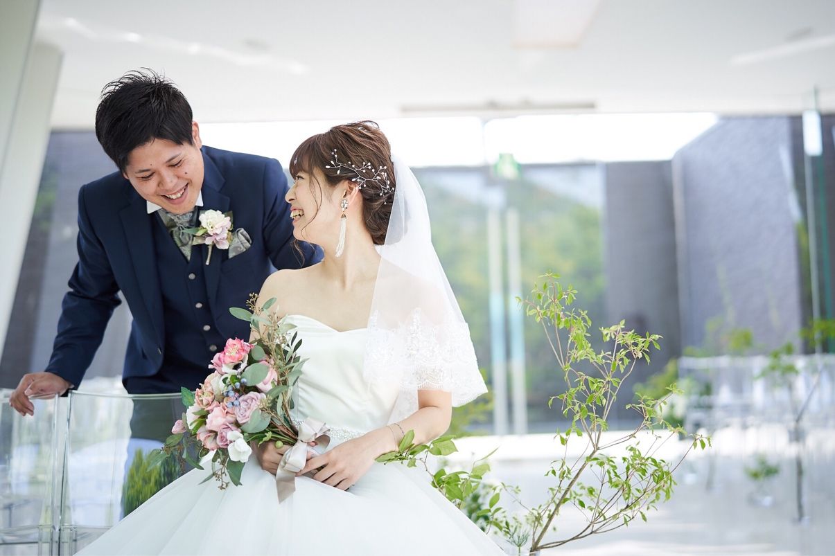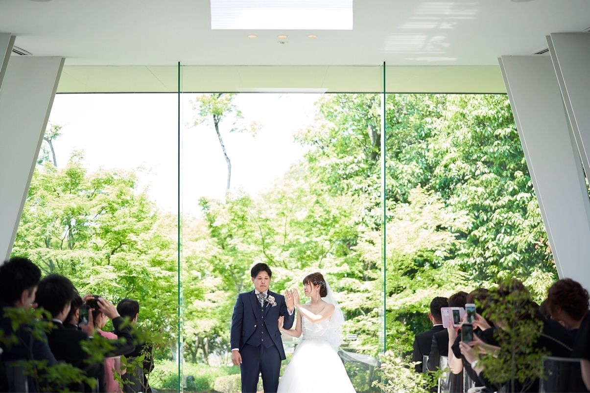 ガラス張りのチャペルでお庭の新緑が綺麗に見えました。光がたくさん差し込む明るい空間で、ガラス張りで大人っぽい雰囲気だけどナチュラルさも感じることができました。