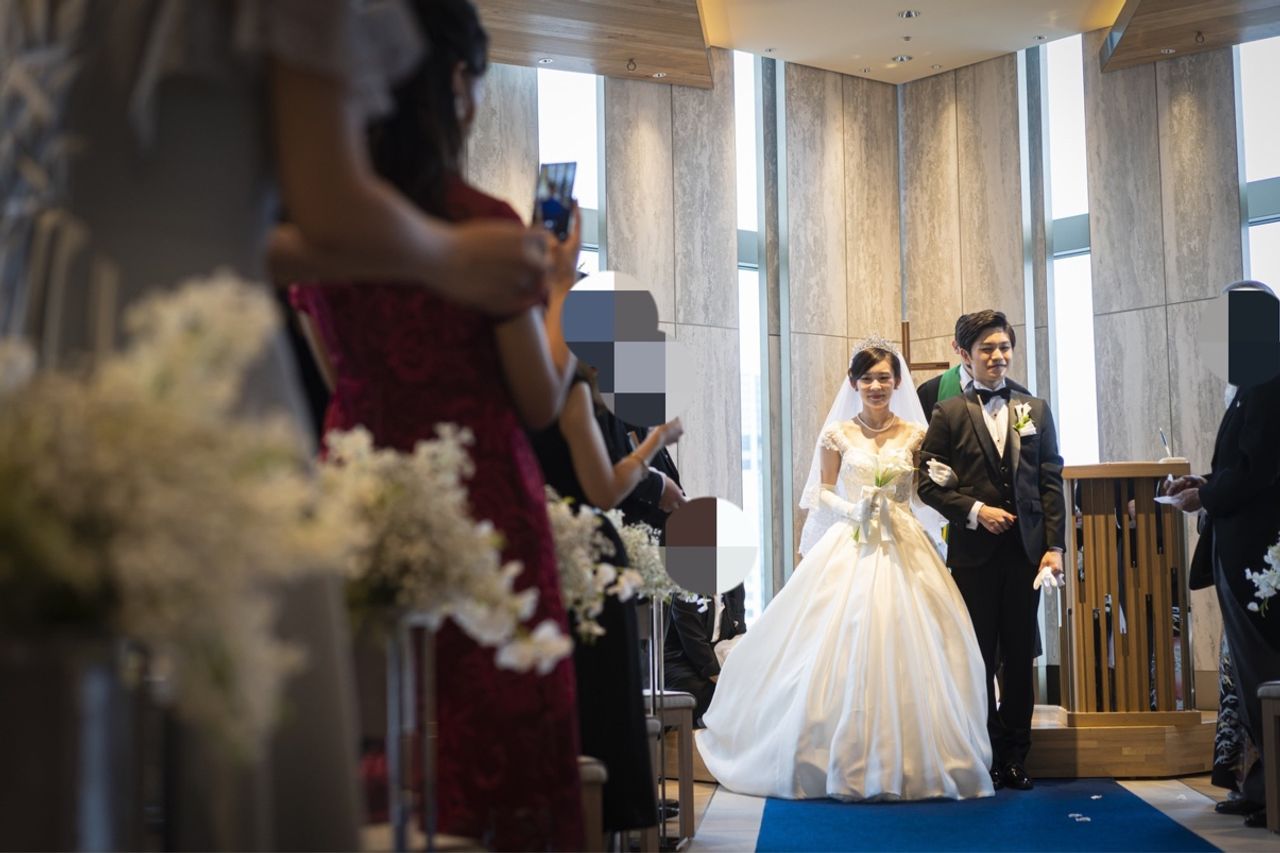 チャペルからの景色は圧巻で、会場を選んだポイントでもありました。入場と同時に自動でカーテンが開き、窓から東京の景色を見ることができました。広くはないチャペルですが、壁面が鏡張りになっていて広く感じました。