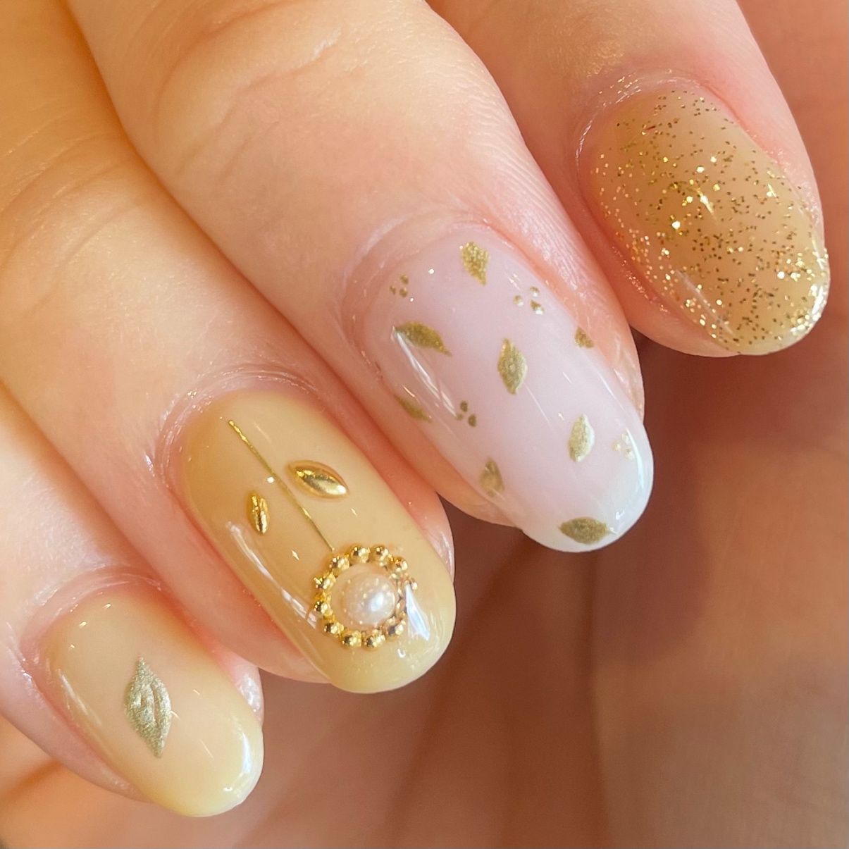 ゴールドのフラワーをポイントに、ナチュラルなリーフネイルにしました。黄色が好きなのでベースに使っています。