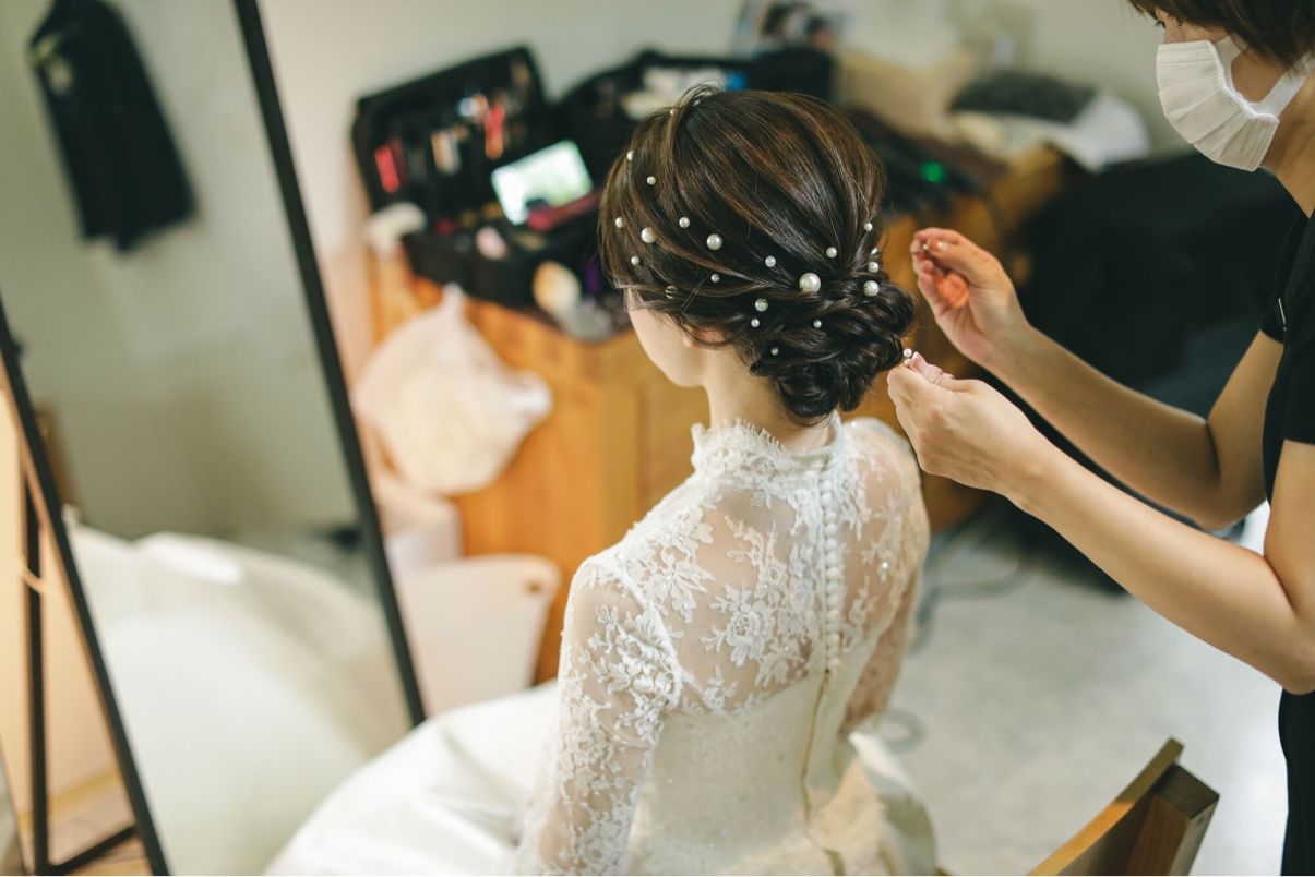 ヘアメイクアーティストのkiyoさんにご依頼し、合計3スタイル作っていただきました。教会での式、ガーデンパーティー、お色直し後のデザートタイムにそれぞれぴったり合うスタイルになりました。