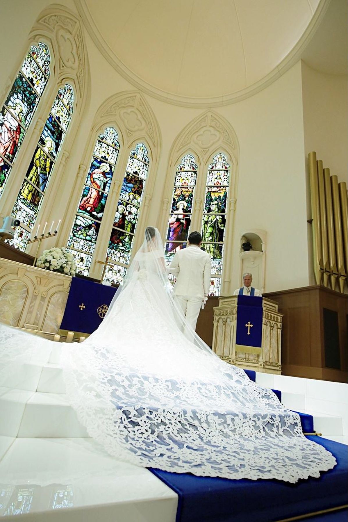 青くて長いバージンロードに本場のステンドグラスが美しいチャペルです。 ナチュラルで明るい、とゆうよりは厳かな雰囲気があるので、クラシカルな雰囲気で挙式をしたい方には本当におすすめです。