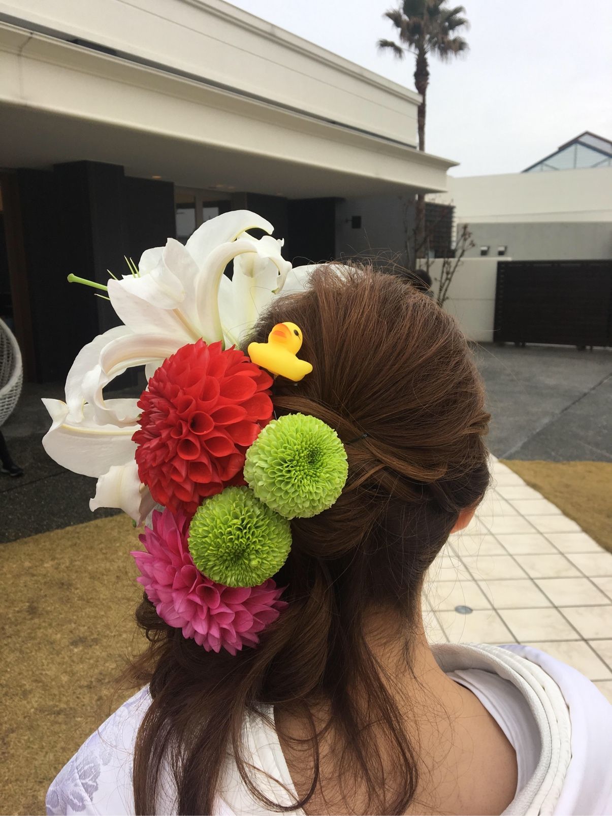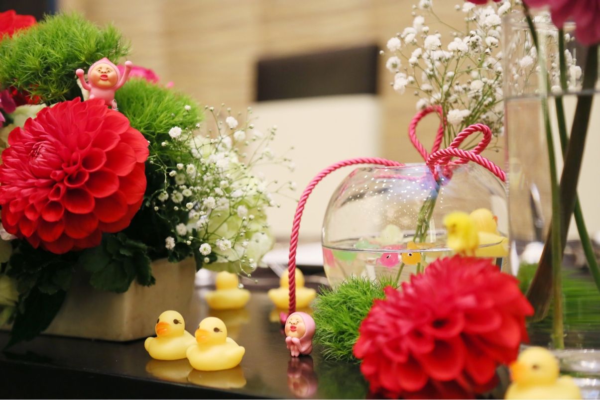 和がテーマなので、ダリアを取り入れました! あとはヒヨコやかくれももじりを入れました!