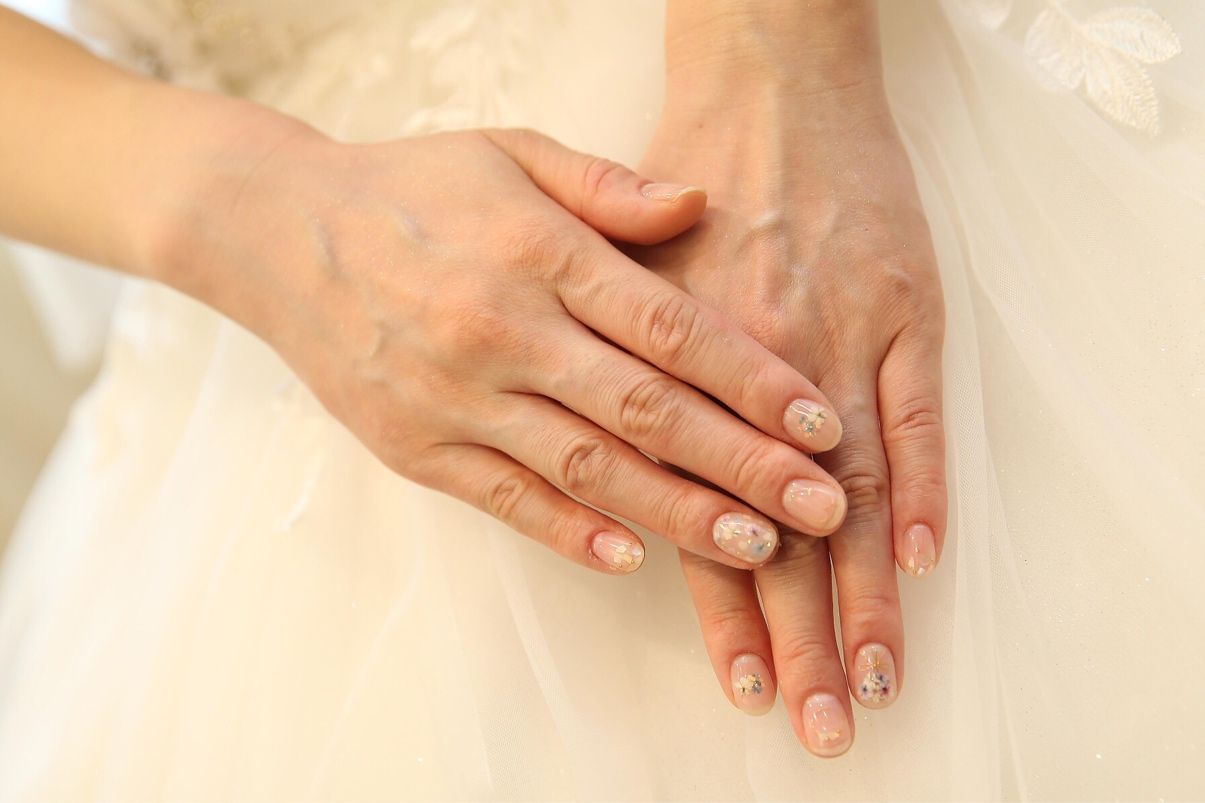 ネイルカラーはクリアでナチュラルにして、そこにお花をたくさん散らしたり、花束デザインをあしらってもらったりしましまた。