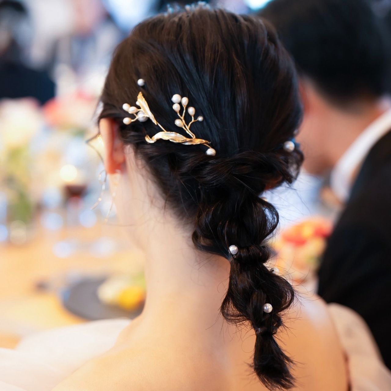 カラードレスではヘアスタイルをチェンジし、葉っぱ型のアクセサリーにパールピンを添えて、ナチュラルで落ち着いた雰囲気にまとめました。