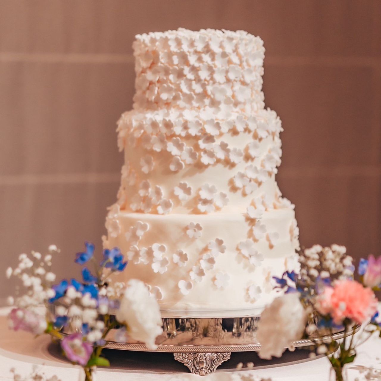 小さな白いお花が飾られたシンプルなデザインのケーキです。
