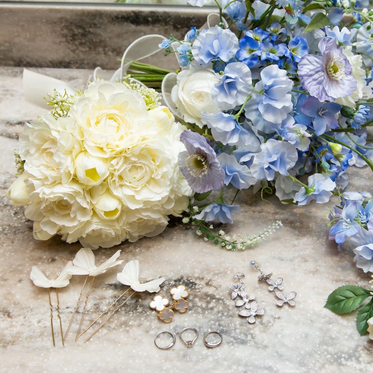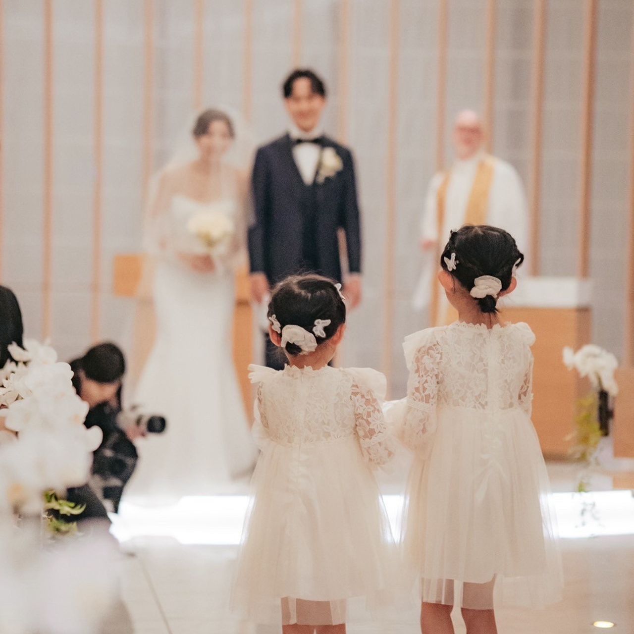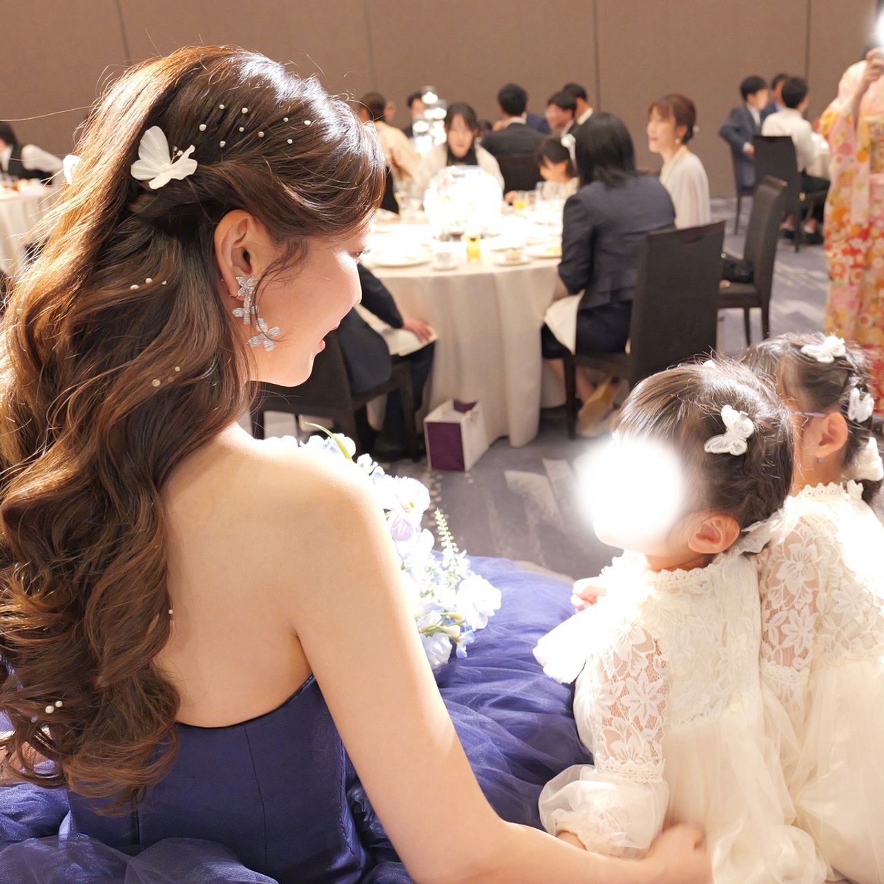 また、2人の姪っ子にはホワイトのドレスを用意し、お揃いの蝶々のヘアアクセサリーを着けてもらいました。