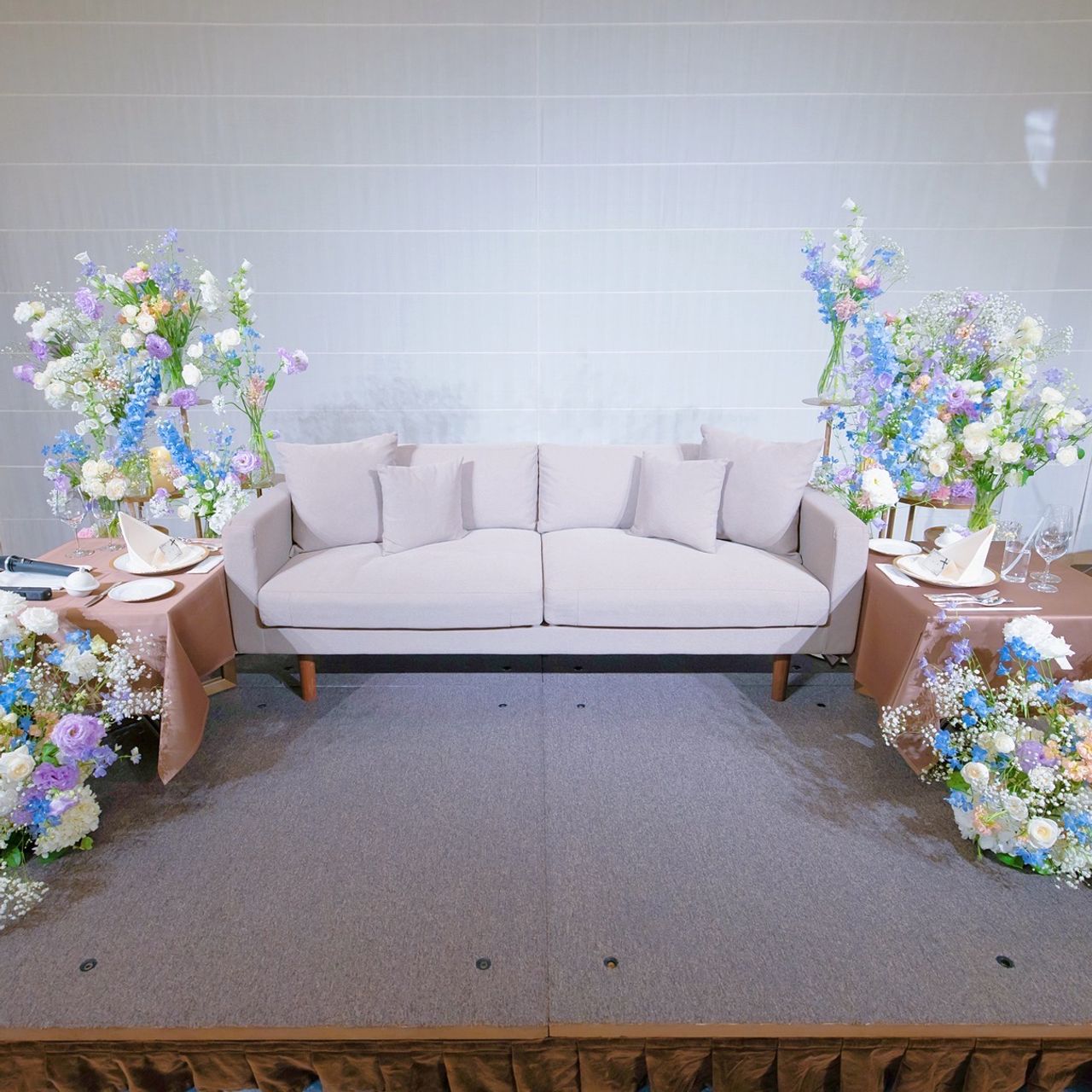 会場装花は淡いブルーを基調にピンクを差し色として取り入れ、春らしさを演出しています。