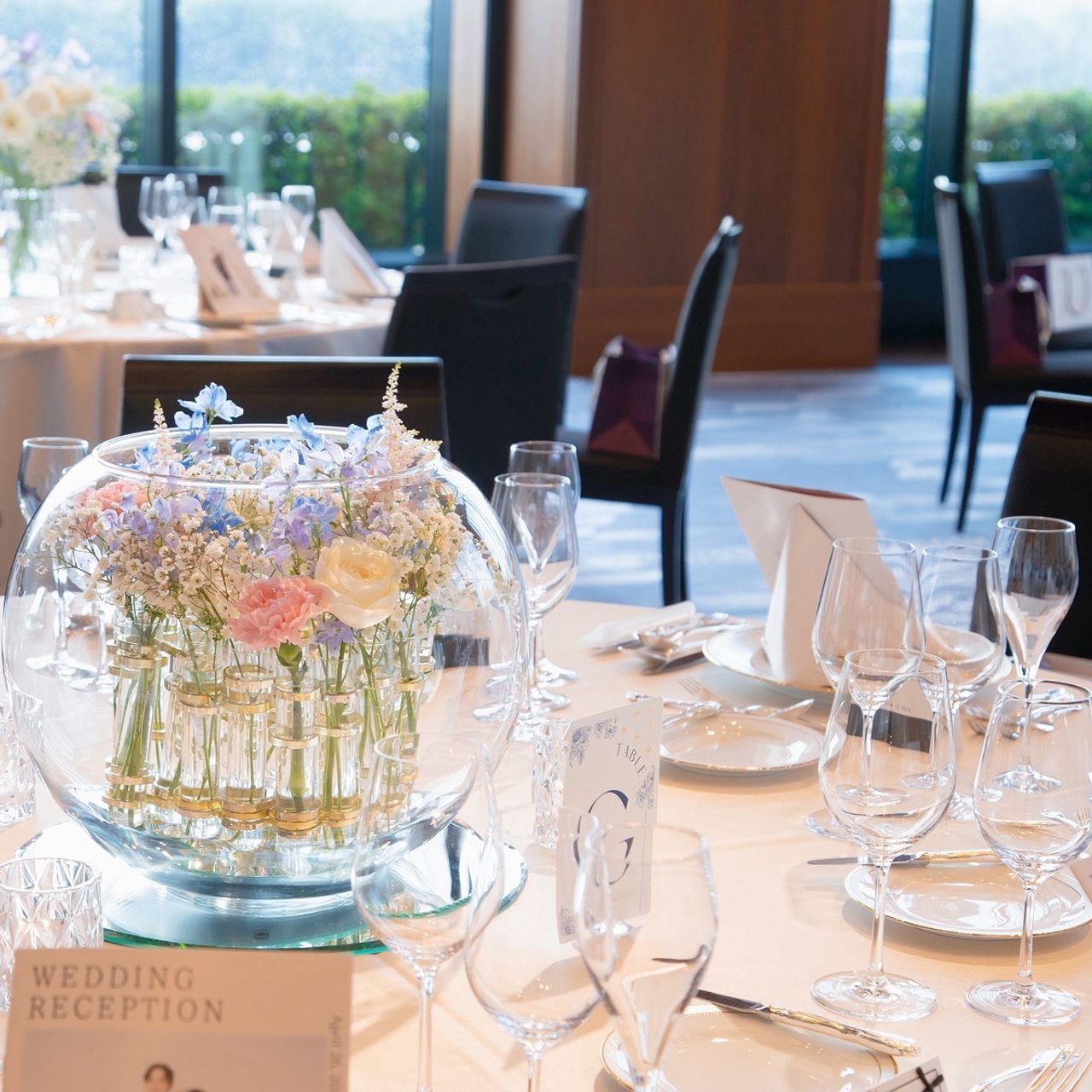 花瓶やキャンドルにもゴールドやシルバーは使わずガラス素材で統一し、透明感を意識したコーディネートにしました。