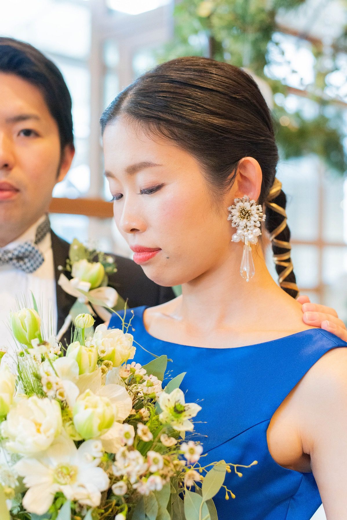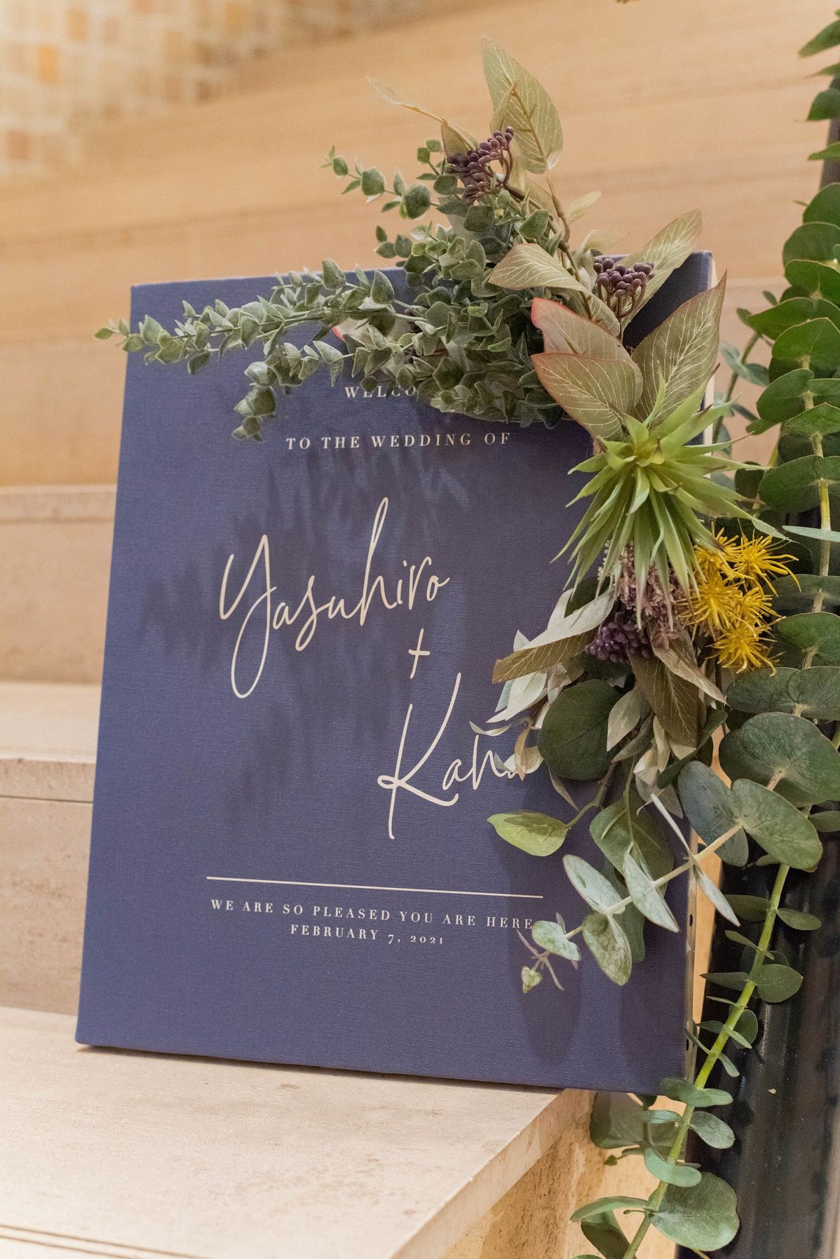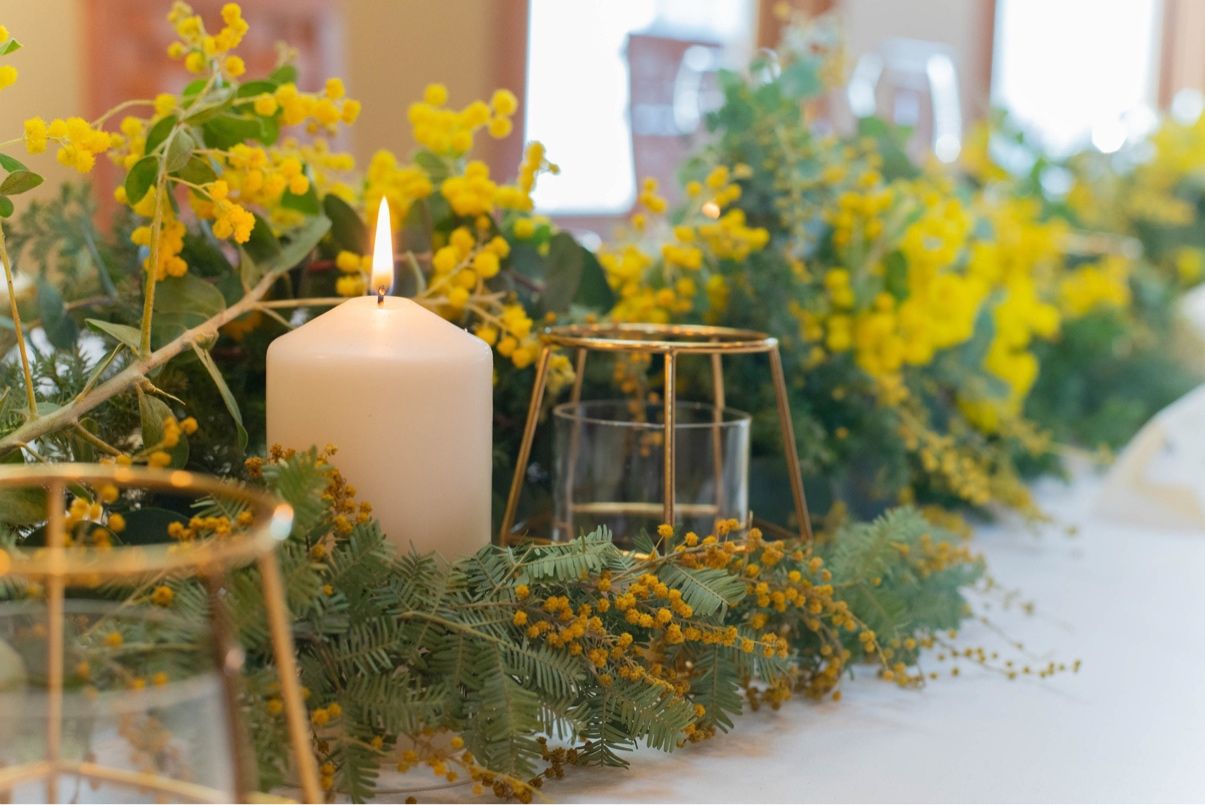 装花は、たっぷりのミモザやユーカリを使ってナチュラルさを出し、小物はネイビーやくすみゴールドの落ち着いた色味を使って、シックな装いとの統一感を大切にしました。