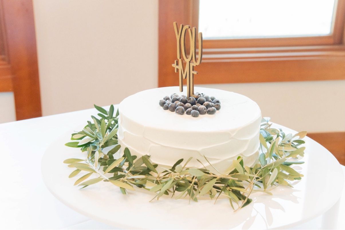 アグネスホテルさんは、生ケーキにこだわっています。シンプルにショートケーキですが、生クリームがミルキーでホッとする味でした。トッピングはブルーベリーに変更し、ケーキの周りをナッペで模様つけ、周りにはオリーブの葉を飾ってナチュラルにしました。ケーキトッパーはネットで買って、ゴールドに塗装しました。