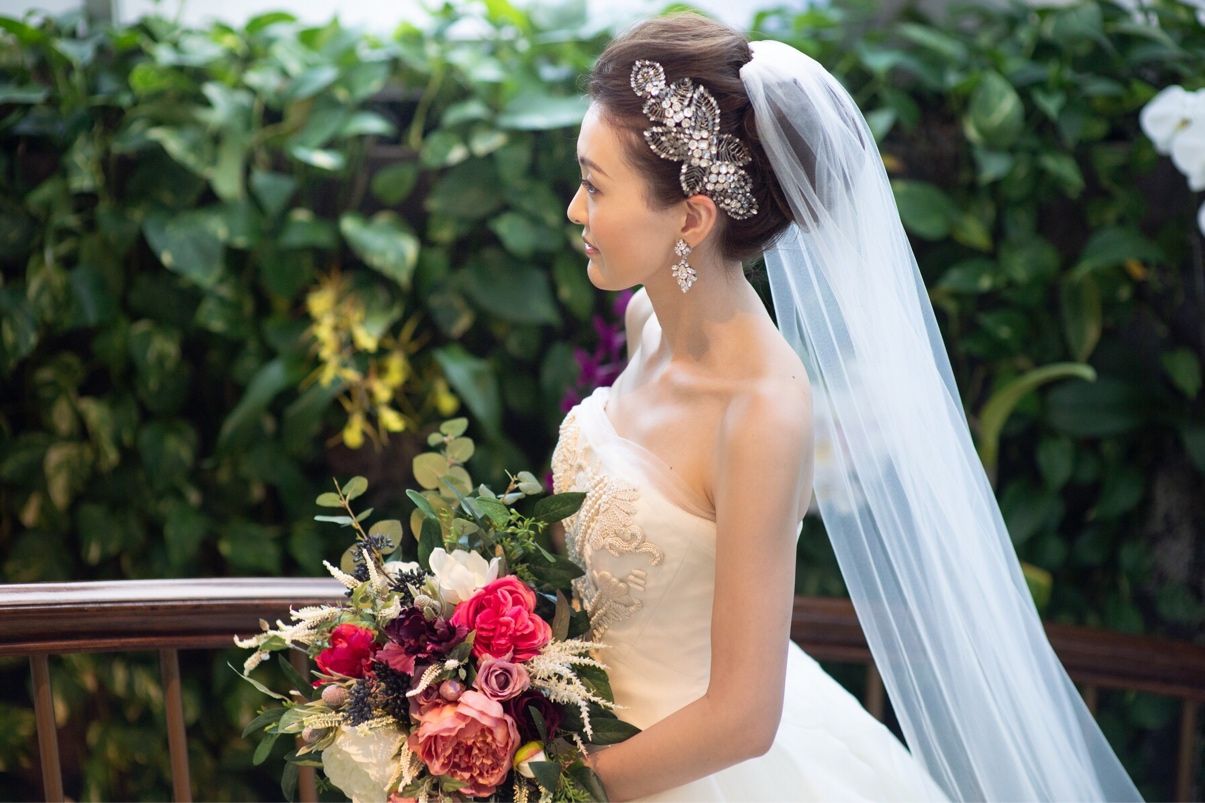 JULIEBRIDAL様でお借りしたマリアエレナのシリーズ、ジェニーパッカムのアカシア(シルバー)、belmaleさんから購入したものを2つ持っていきメイクさんと決めながら着用しました。