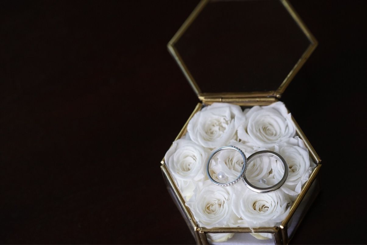 国内披露宴では浅めのフレンチに薬指にだけストーンをのせました。