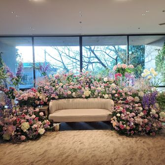 テーマは『ナチュラル韓国ウェディング』です。韓国で前撮りを行い、お色直しのドレスも韓国っぽいキラキラビジューのドレスを選びました。また、韓国のフォトブースを参考にメインテーブルはお花でもりもりにしたところ、ゲストからも大好評でした♡
