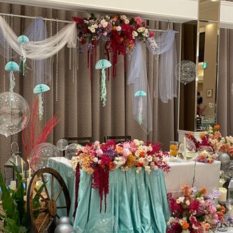 テーマは、リトルマーメイドweddingです!幼い頃から夢見ていたアリエルになる為、装飾・演出には特に拘りました!式場内は、エリック王子のお城に魚たちが装飾をしたような雰囲気を作ってもらいました💓