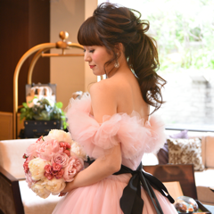 色も4色展開で大人っぽいお色が多いです。私は会場でが暗めのお色だったので、ドレスが映えるようにベビーピンクを選びました。