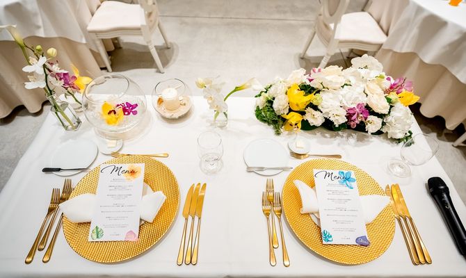 沖縄らしく、リラックスできて楽しい空間に。アットホームなお式にしたくて、ゆったりとした進行でゲストとの会話もたくさん楽しみました。式場はこだわりがないと思っていましたが、写真を見て美らの教会(ザ・ギゾノリゾート)のチャペルに一目惚れ!天井の高さがポイントでした。