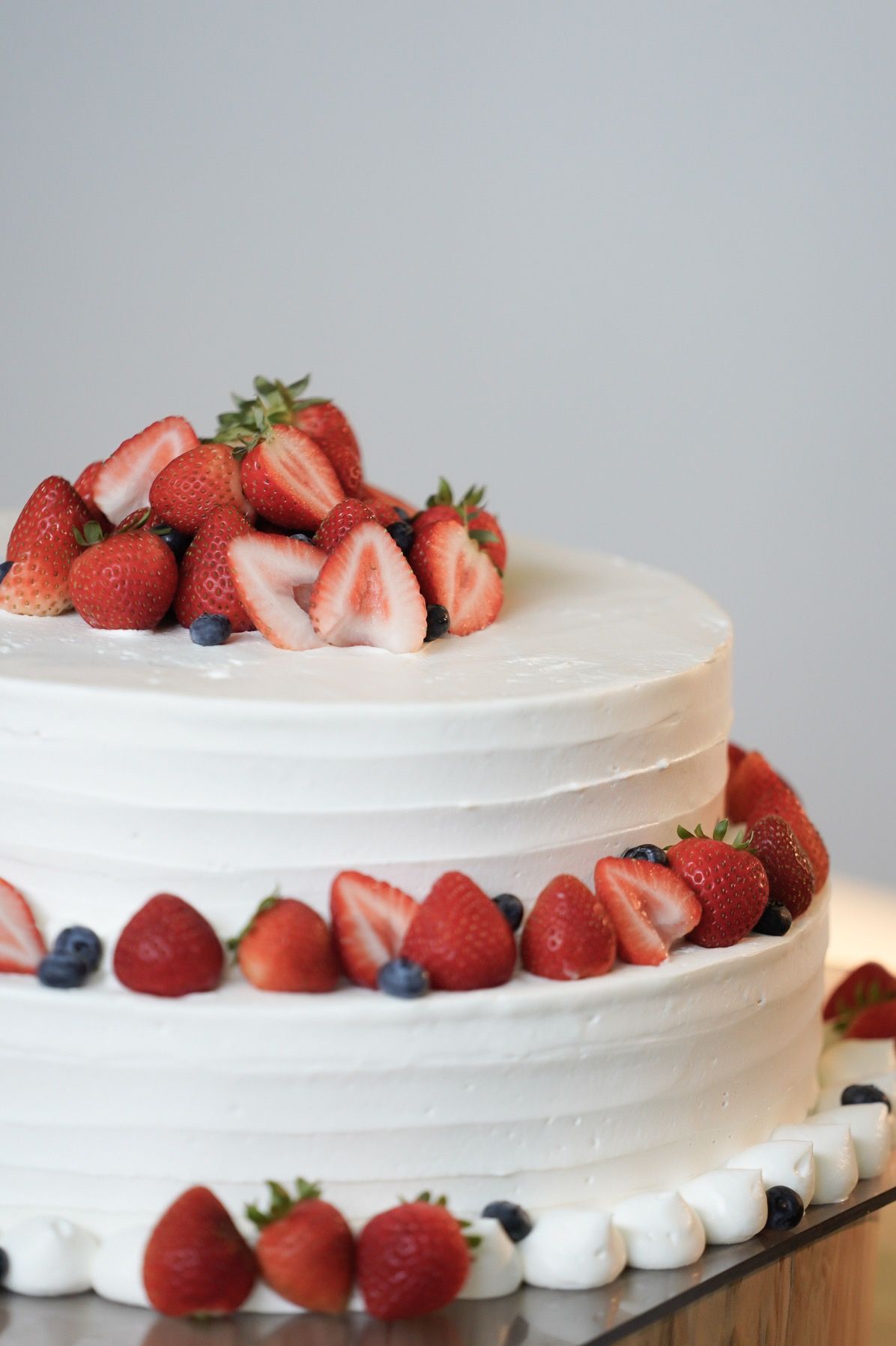 いちごが大好きなのでシンプルにいちごたっぷりの3段ケーキにしました。生クリームはボーダー柄に塗り、いちごは断面や葉っぱを見せることでよりかわいく見えるようにしてもらいました。