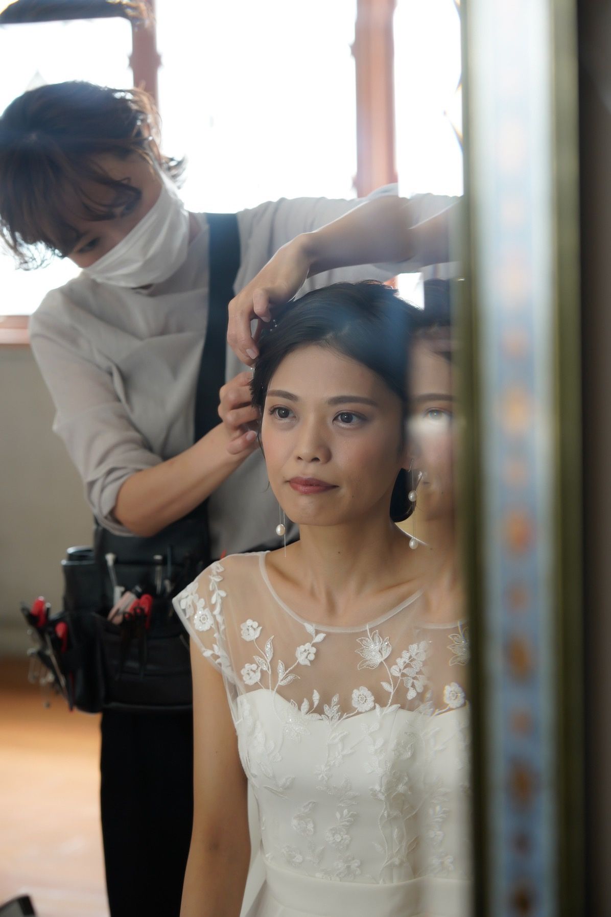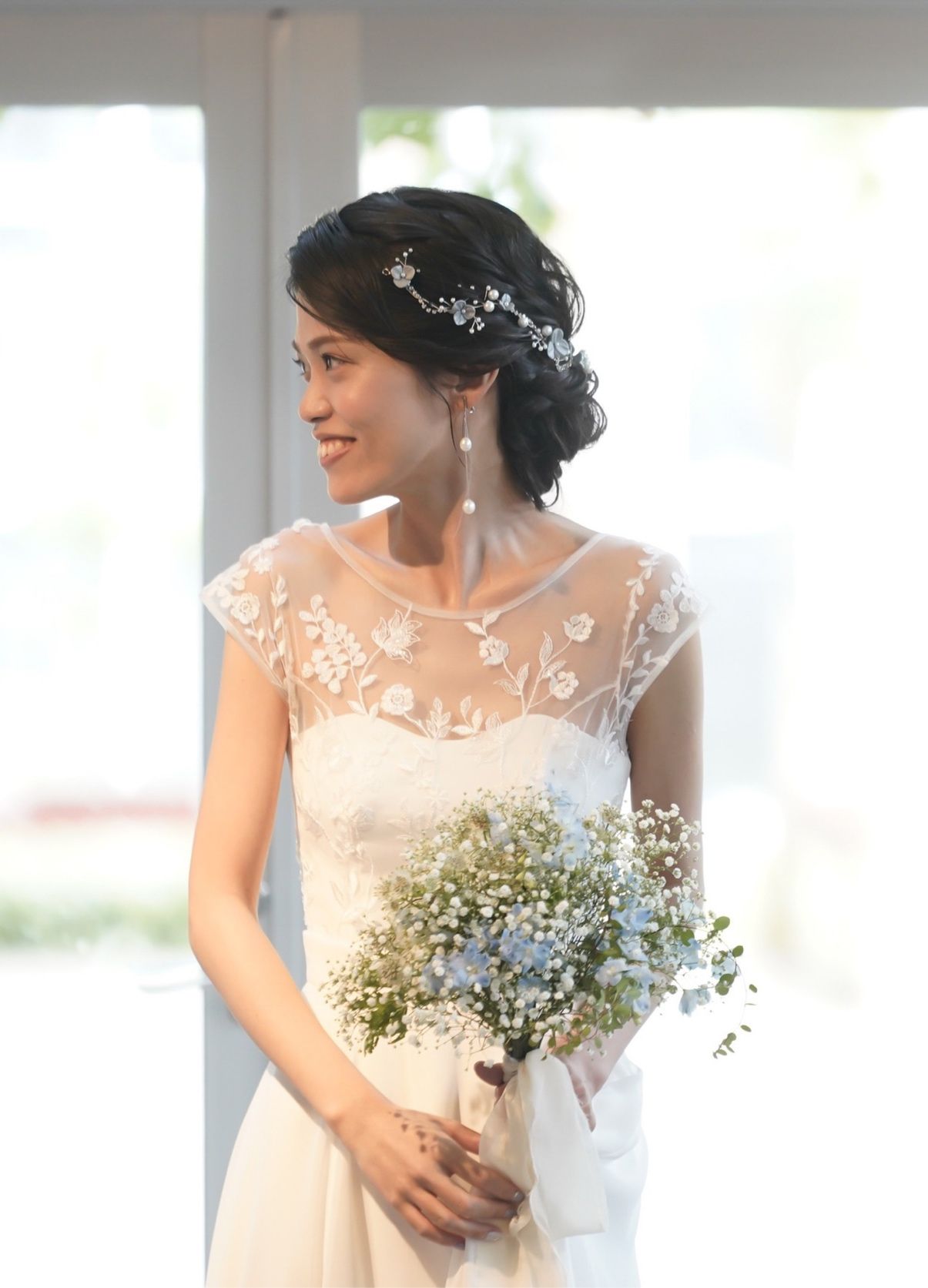 メイクは完全にお任せでナチュラルにしてもらいました。挙式時と披露宴前半はシニヨンで前髪は分けてすっきり、アクセサリーはシルバーで華奢なものを用い上品にまとめてもらいました。