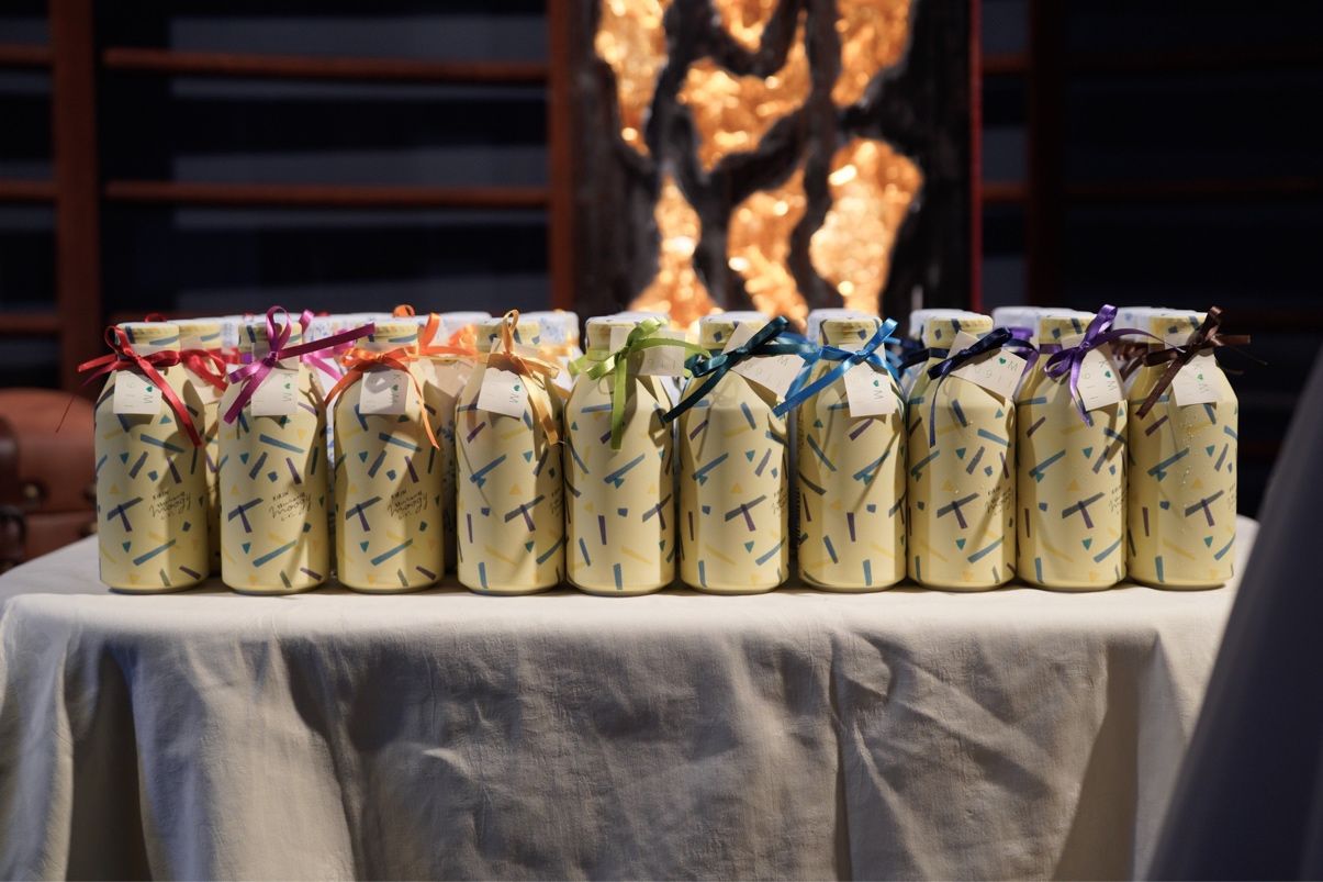 披露宴終了まで冷蔵庫で冷やしていただきましたmoogyにリボンとタグをつけてお渡ししました。挙式のみ参列のゲストにはぶどうの木の焼き菓子2品、お子様ゲストには駄菓子詰め合わせをお渡ししました。
