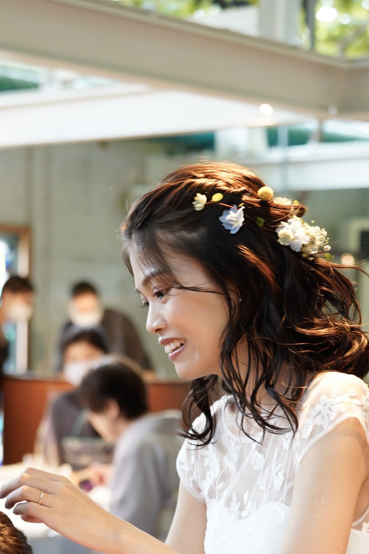 披露宴後半ではハーフアップ+生花のアレンジに変更してよりリラックス&ガーリーな雰囲気にしてもらいました。
