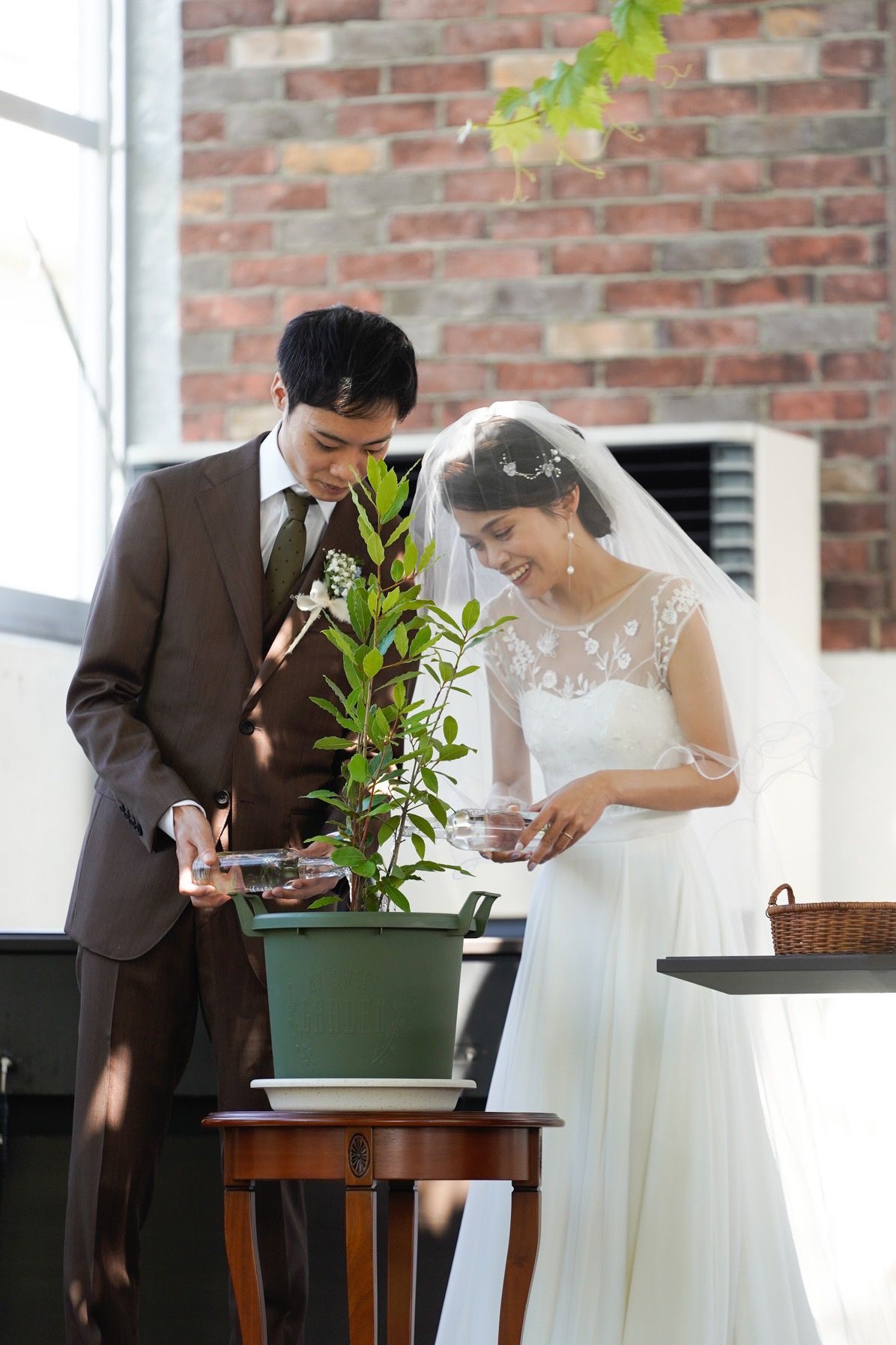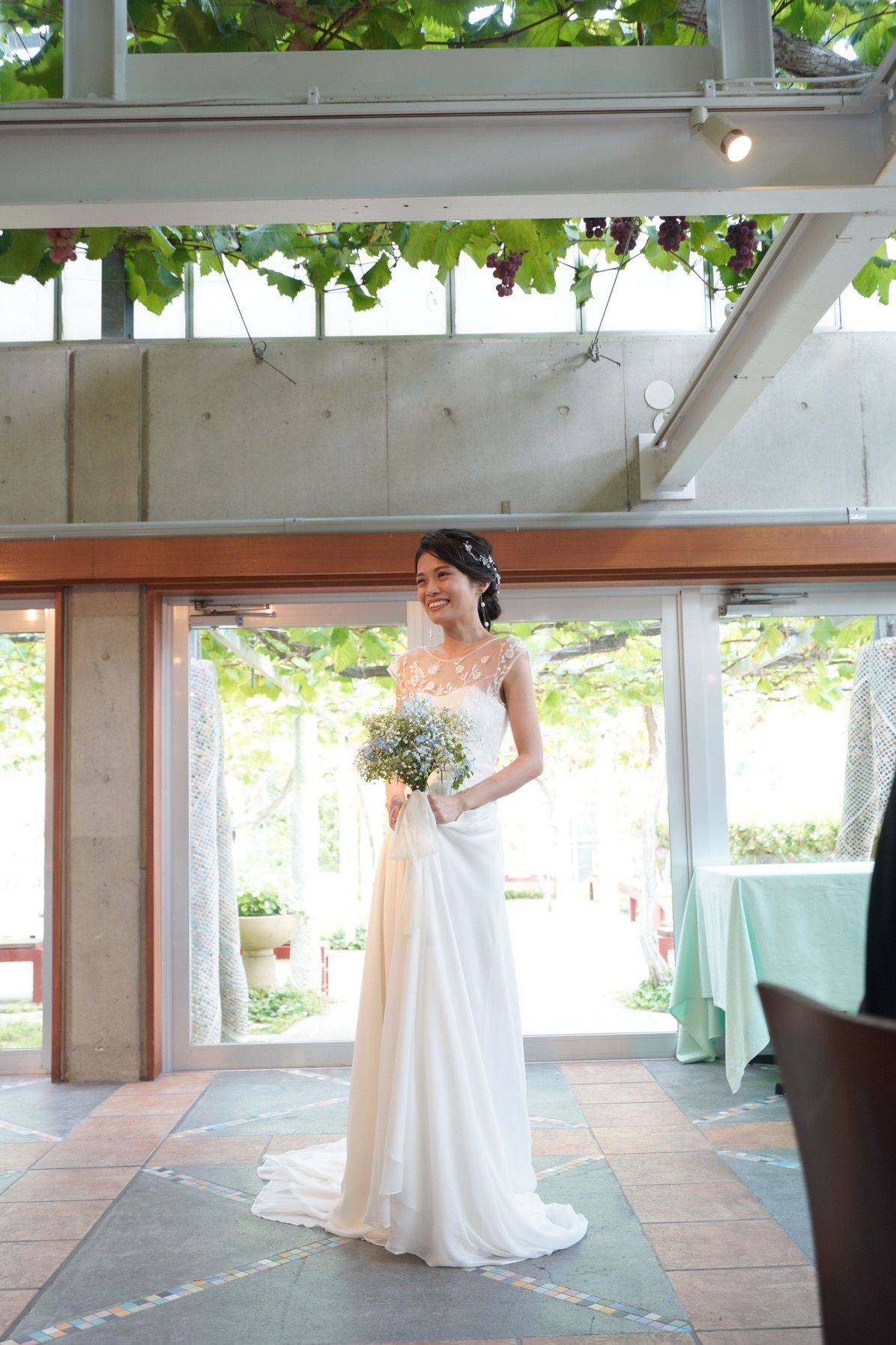 ぶどう棚が天井一面に広がっていて季節ごとに雰囲気が変わるのが素敵です。私たちが挙げた9月はぶどうがいっぱいなっていました。併設のガーデンや床のカラフルなタイルの雰囲気もかわいらしくて気に入っています。