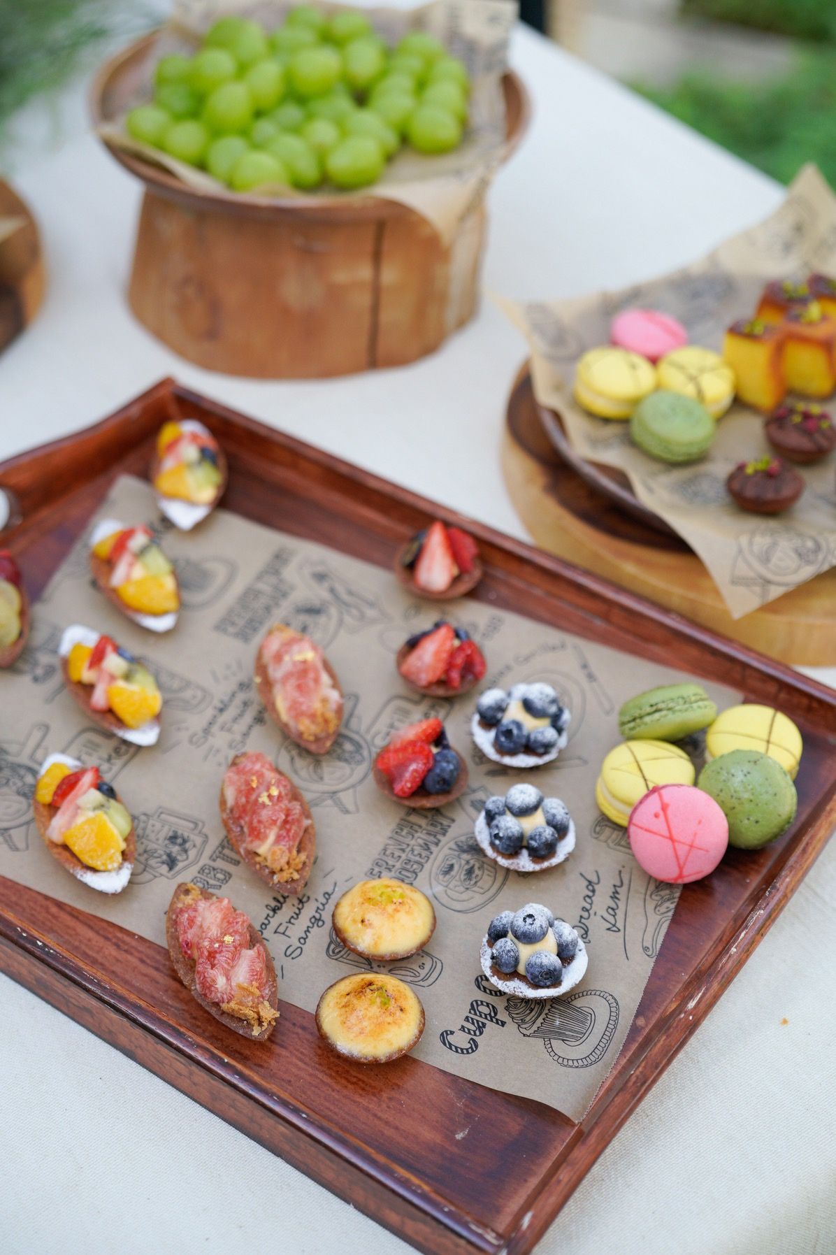 魚料理の付け合わせには地元の名産である加賀れんこんを使ってもらいました。県内にもケーキショップをたくさん展開しているぶどうの木なのでデザートはケーキビュッフェにしました。ゲストからもとても好評でした。ゲストにベジタリアンの方がいましたが別メニューで対応していただけました。