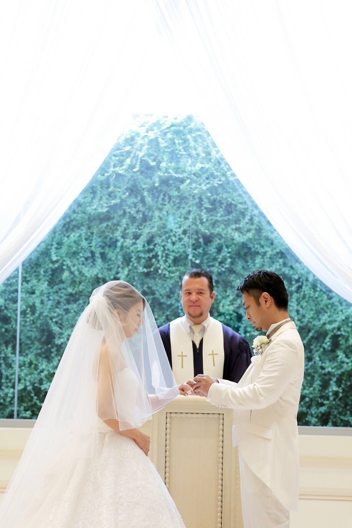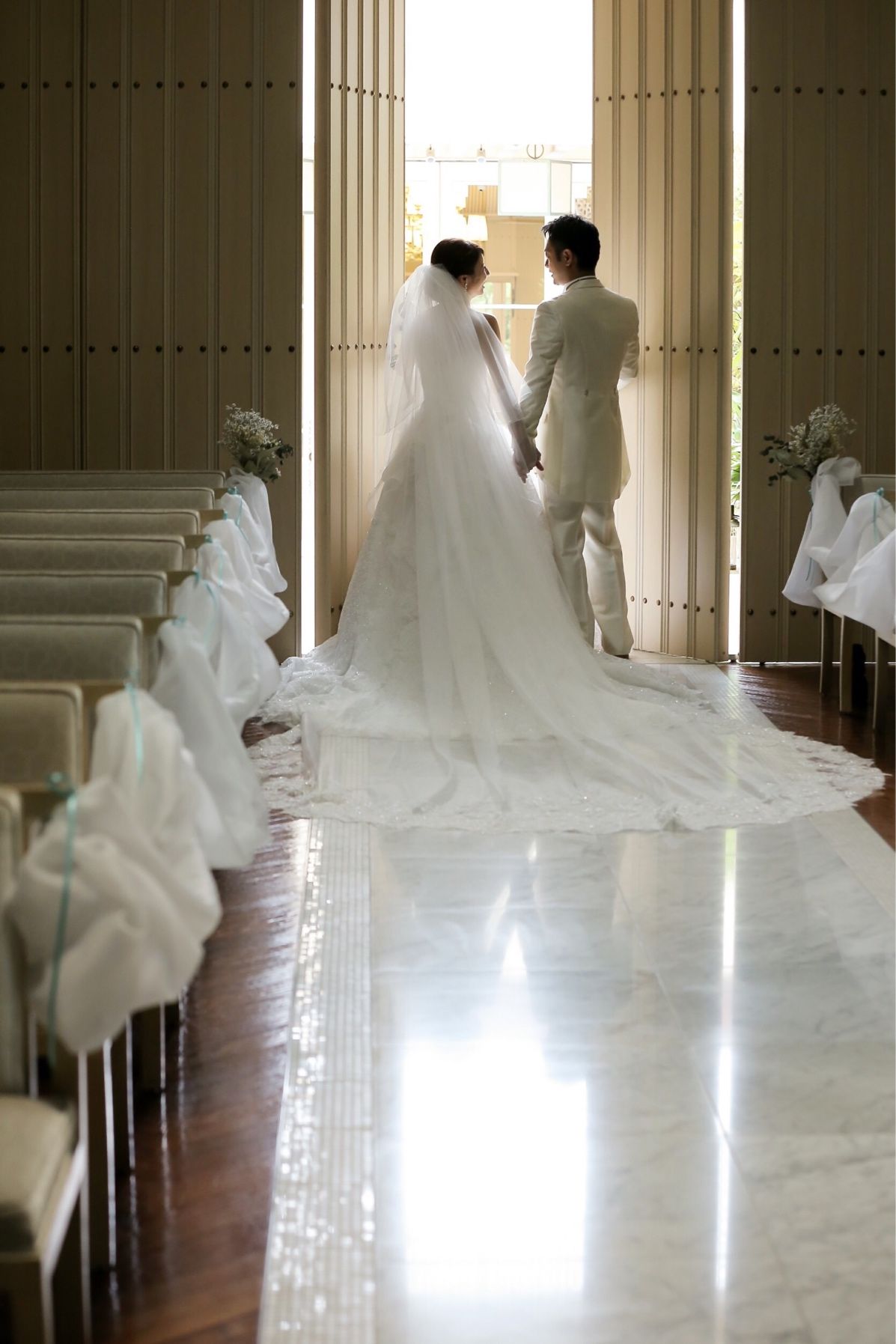 定番の赤いバージンロードではなく、全体的に白ベースに正面の青いカーテンがとても映えていて素敵なチャペルでした!!