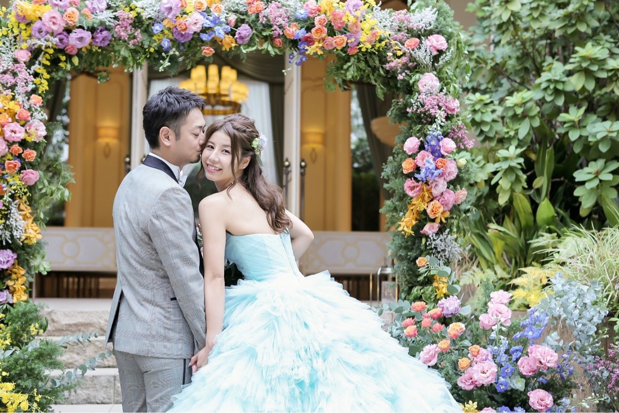 ウエディングドレスが華やかな分、 カラードレスは可愛い系で探していて、 式のテーマカラーがティファニーブルーだったので、水色にしました!! 胸元も開きすぎず、シンプルなデザインな分、スカート部分のボリュームが目立ってシルエットもお気に入りです!!