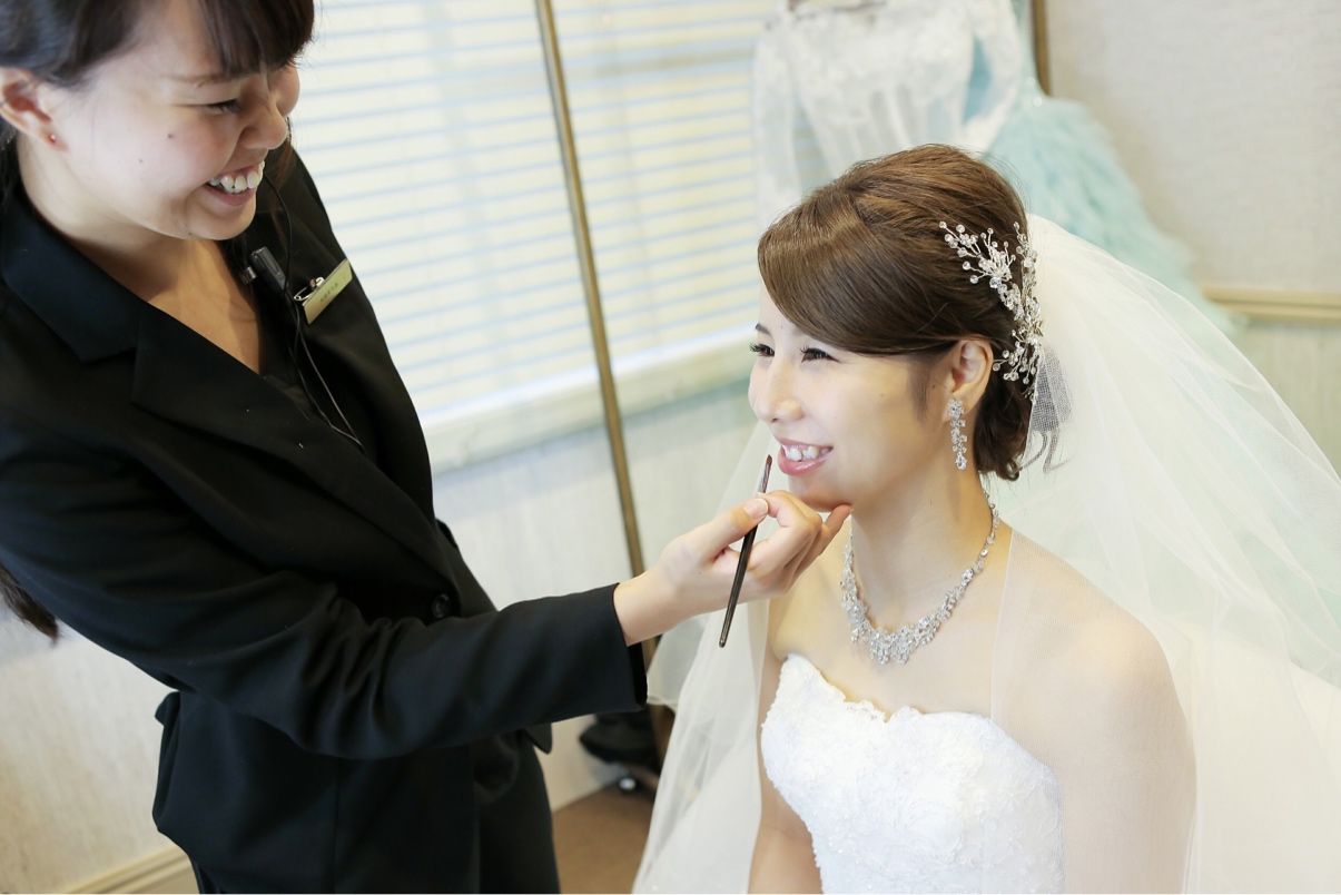 挙式・披露宴・カラードレスで変えたかったので、 挙式では前髪を横に流し、後ろは下めのアップで、 披露宴では前髪をセンター分けにして、後ろはそのままで生花に変更。 カラードレスはハーフアップでブーケに合わせた生花に変更し、 口紅もウエディングドレスは赤系で カラードレスはオレンジ系にしました!!