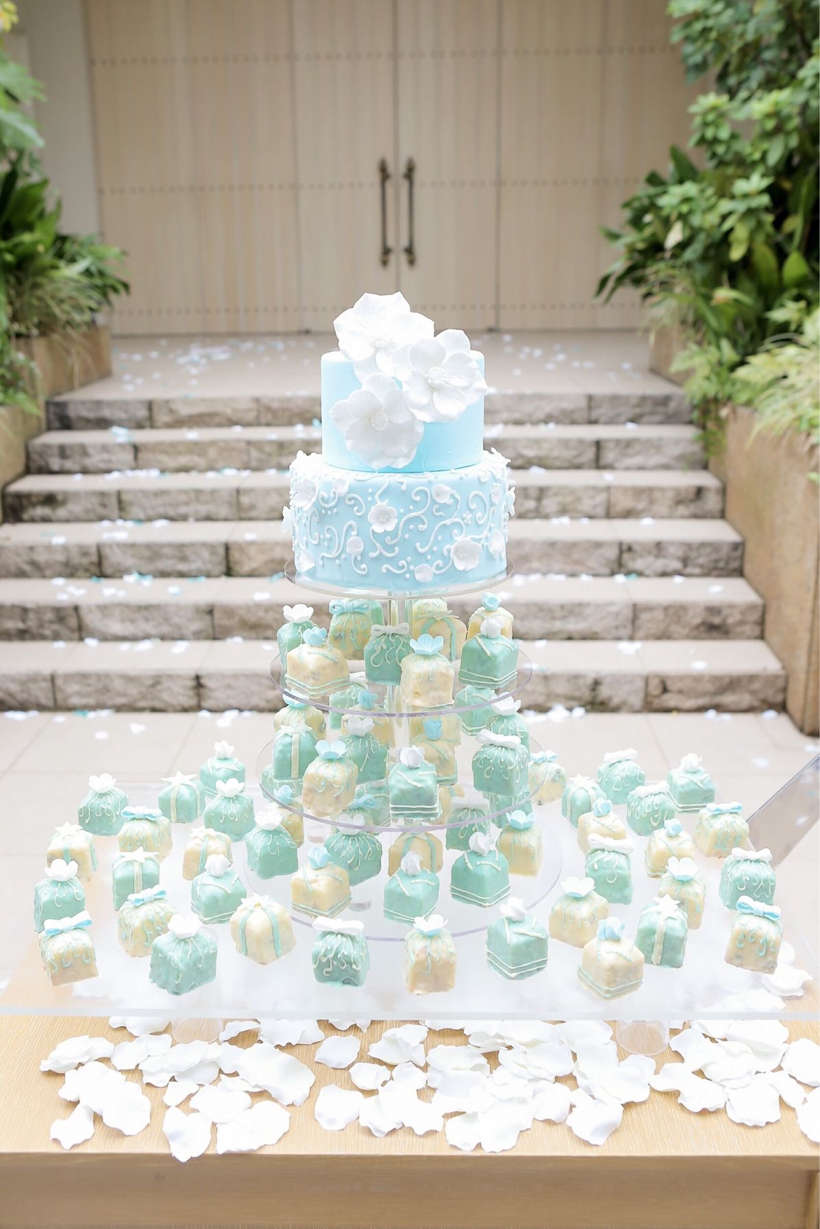 ティファニーブルーがテーマカラーだったので、ティファニーブルー色の小さなケーキで作った、5段のタワーケーキにしました!! タワーケーキにした理由は、 みなさんの手元に配られたときに、見た目が可愛い状態で届けたかったので、 小さな四角いケーキをたくさん作ってタワーにしてもらいました!!