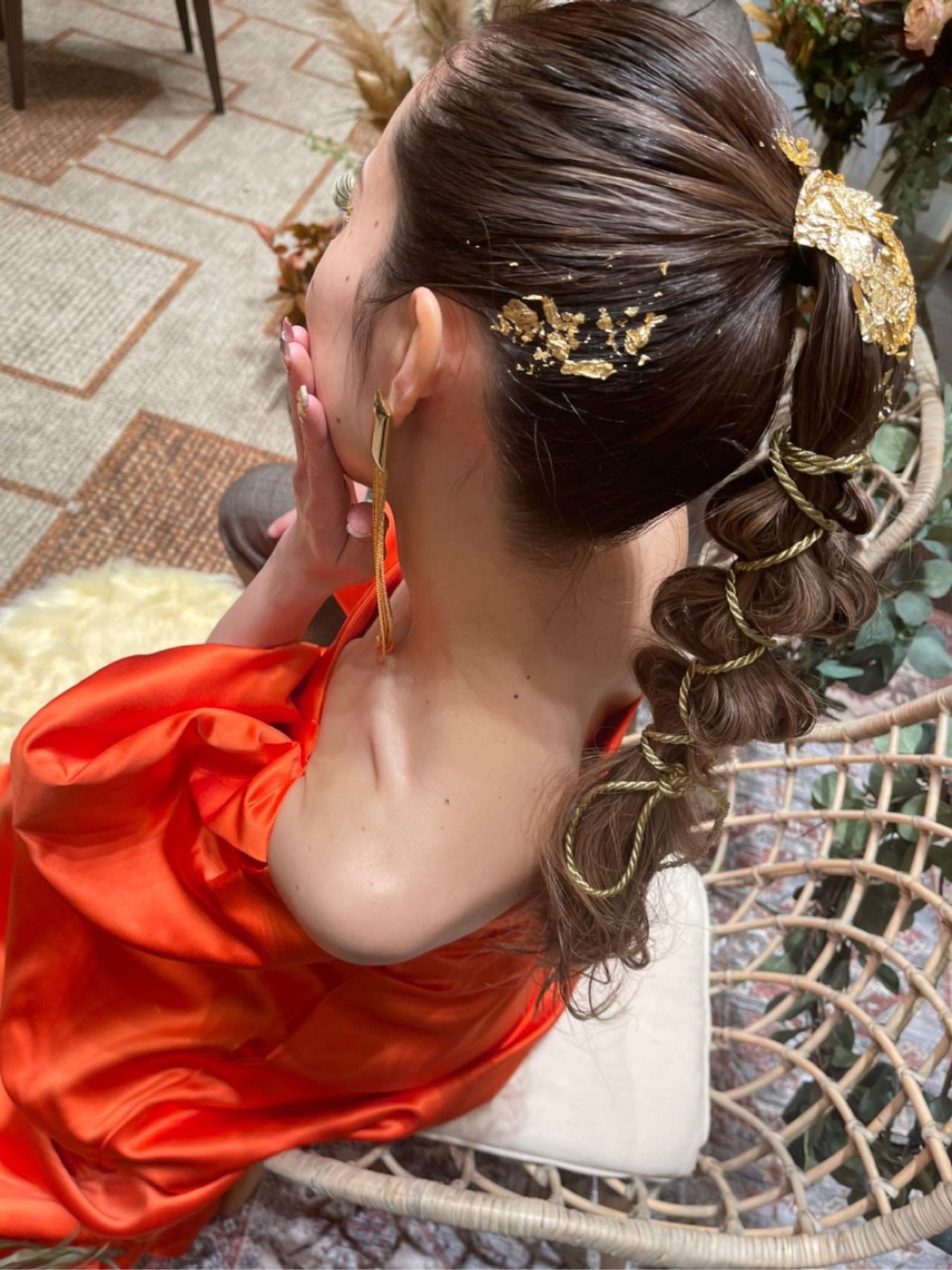 2着目は金箔を髪にのせ、ゴールドの紐でポニーテールを編んで頂きました。