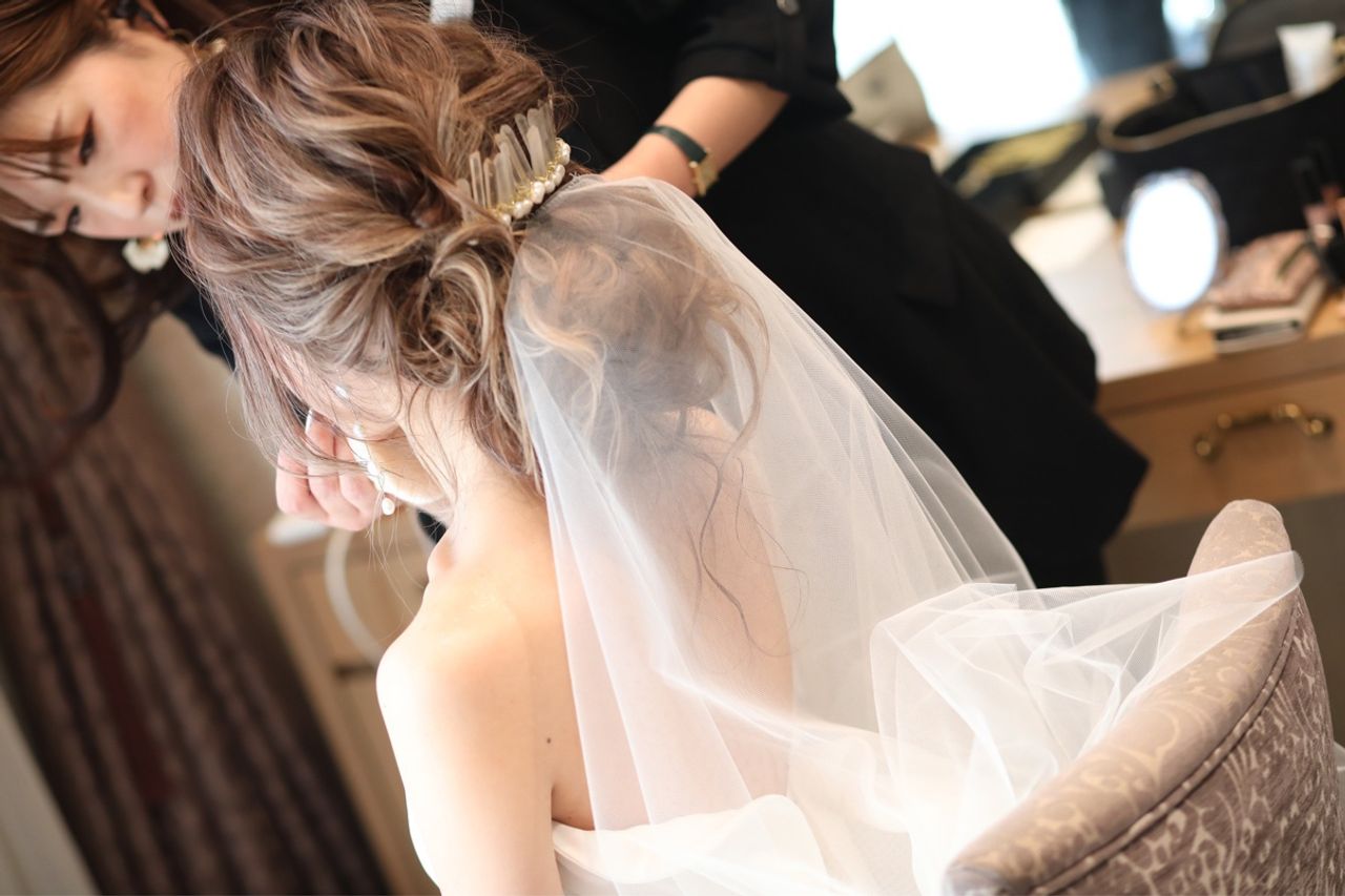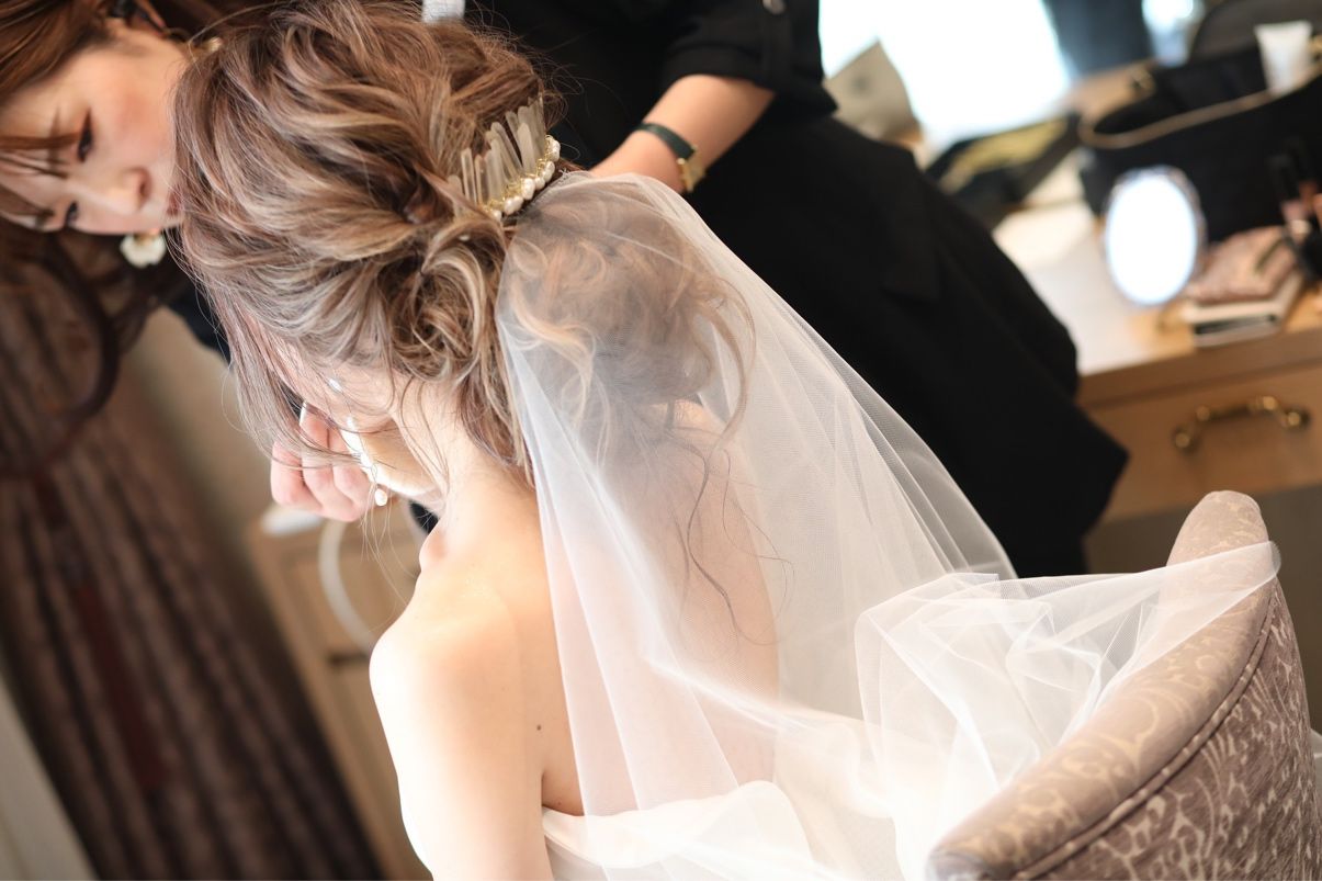 1着目ではパールとクリスタルのアクセサリーを使用しました。ベールは挙式ではMIRROR MIRRORのシンプルなものを使用して腰のリボンが透けて見えるようにしました。挙式のあとは、ベール全体にパールが散りばめてあるベールを使用しデザインを変えました。