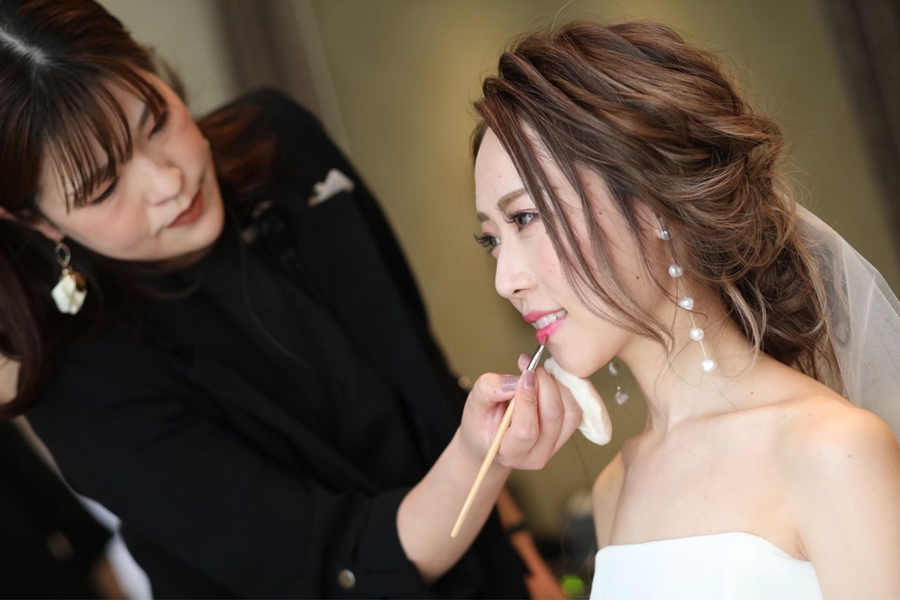 1着目は海外ウェディングのようなゆるいアップヘアにピンクのリップで純白さも残すイメージでつくりました🤍