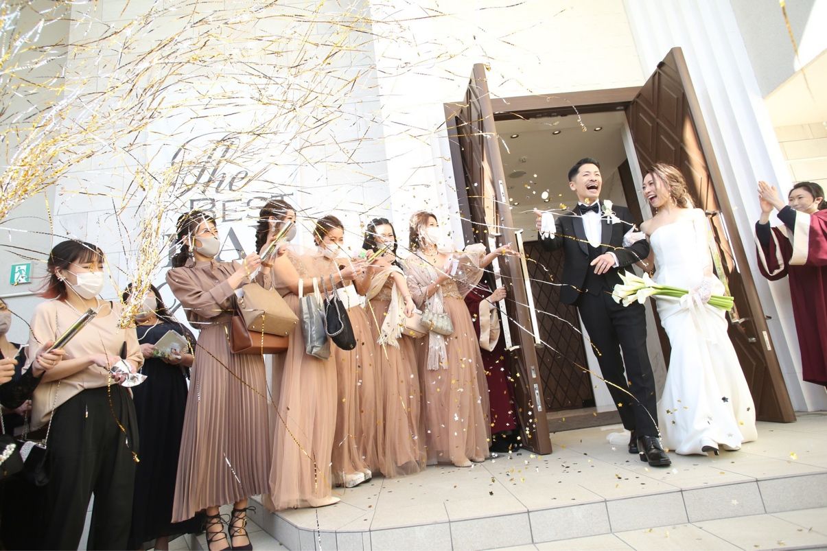 挙式会場は外から見るとケーキみたいな三角の形をしていて、中に入るとゴールドのキラキラが天井から降ってくるようなデザインになっていてとてもキレイです。