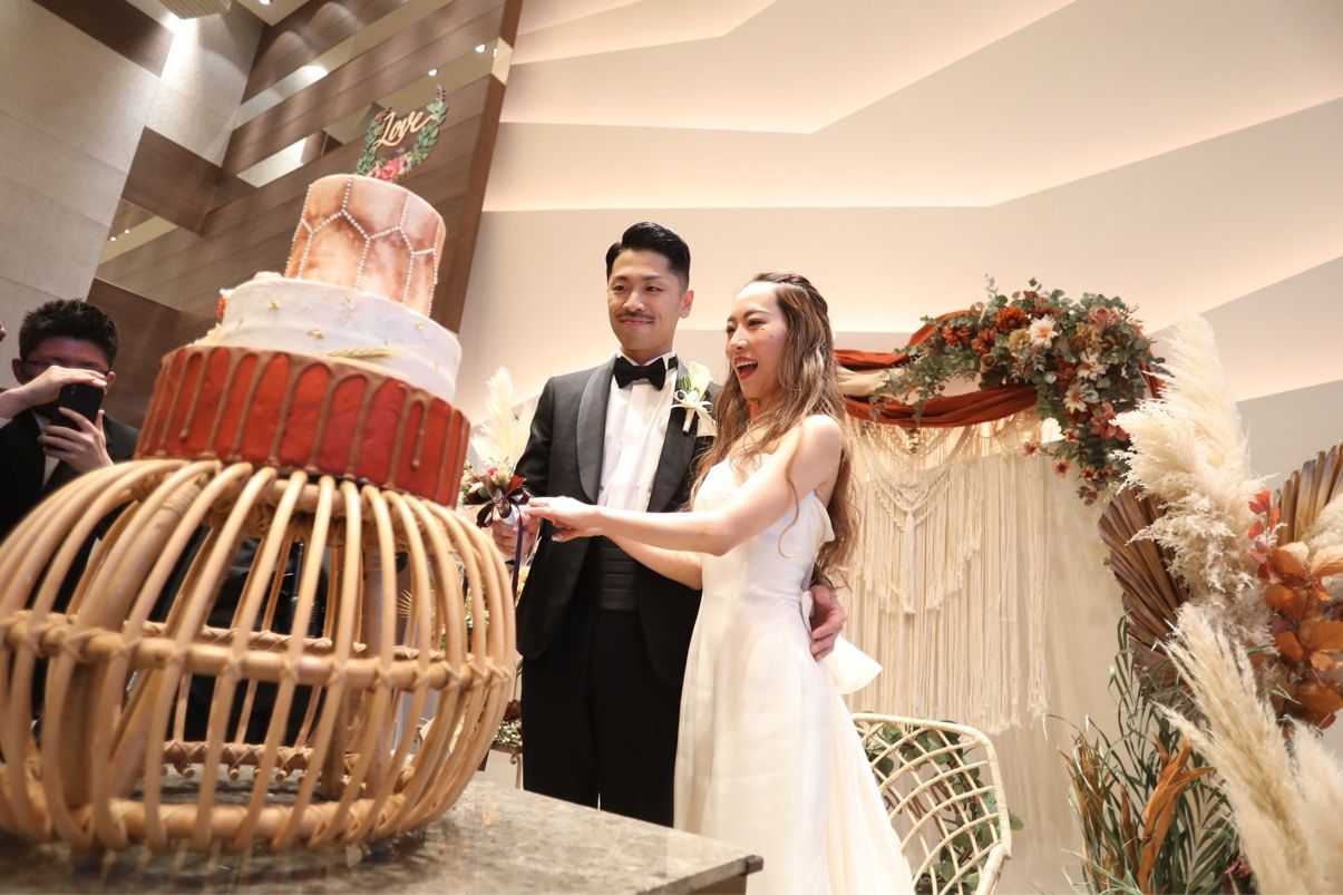3段のウェディングケーキで、テラコッタカラーを入れ、花は自分で準備しました。ラタンの台をケーキの下に敷くことでよりBohoらしさを出しました。
