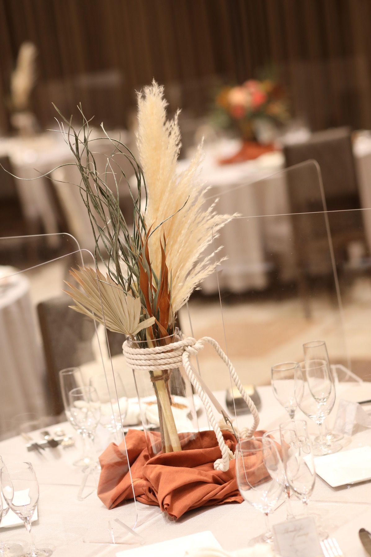 パンパスグラス、グレベリア、パームリーフ、テラコッタカラーの花🌼🌿何度もフローリストさんと打ち合わせをしイメージを合わせました。