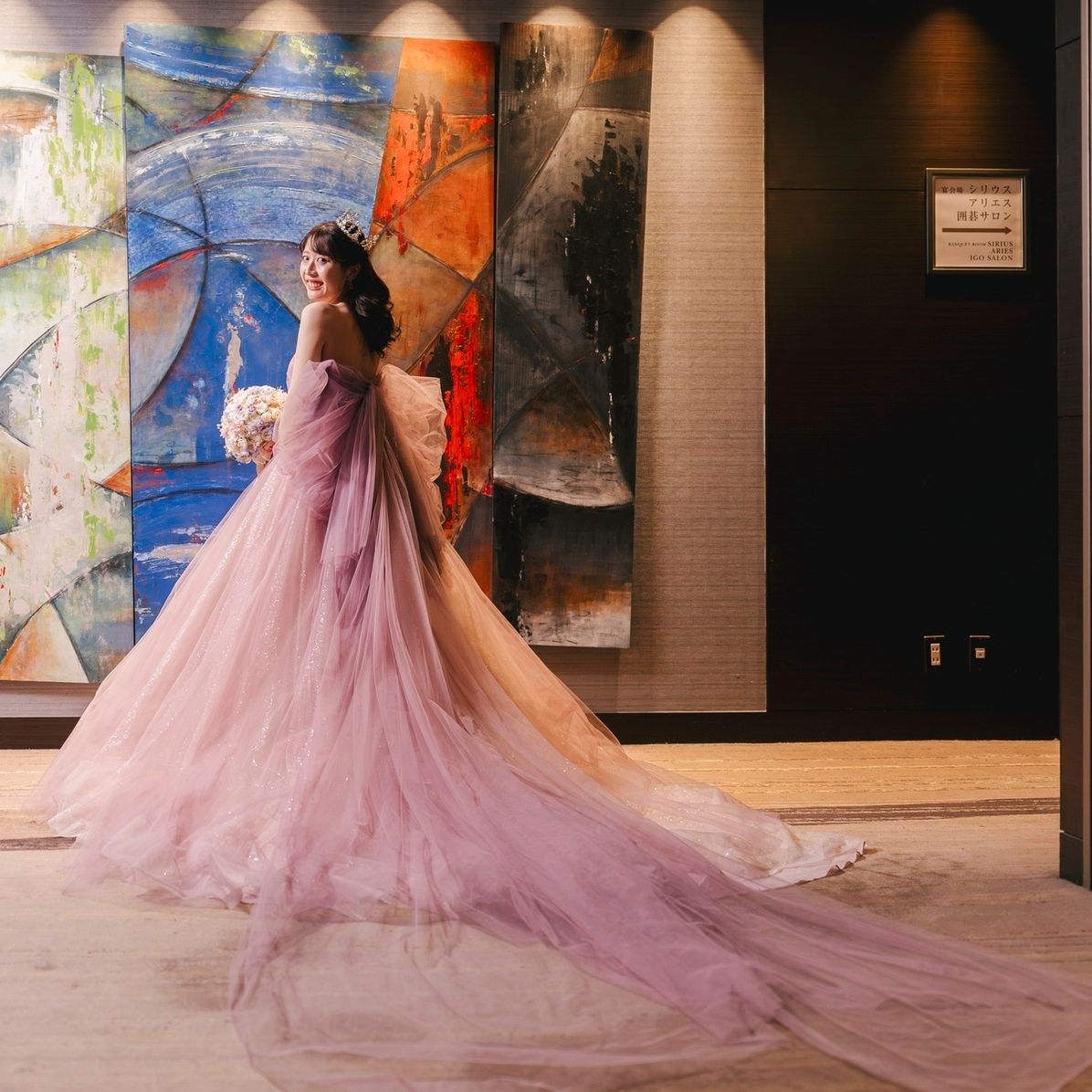 お色直しでStellaを着る際は、後ろのリボンに合わせてキラキラのリボンのイヤリングを着用しました🎀