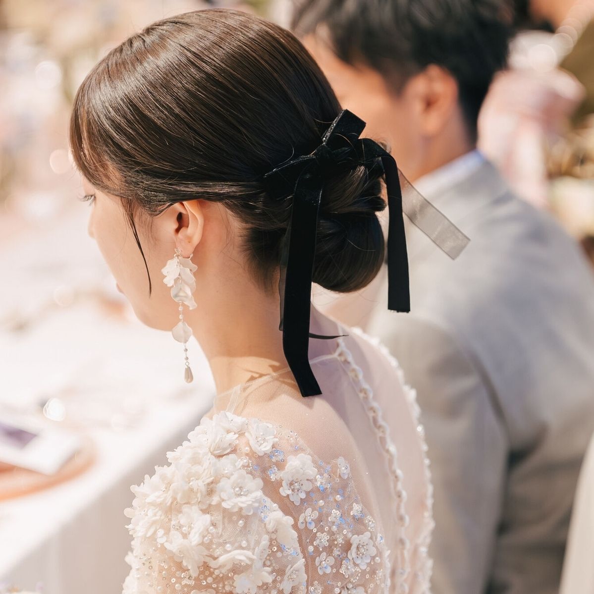 披露宴入場では袖をつけたので、すこし韓国風をイメージしてシニヨンのところに黒のベロアのリボンをつけました🎀